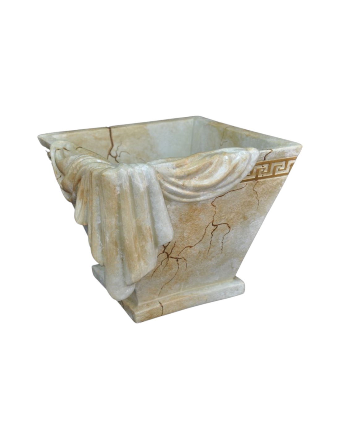 Cette magnifique jardinière de style grec, réalisée avec soin, apporte l'élégance intemporelle de l'Antiquité à votre intérieur. Fabriquée en résine de haute qualité, elle présente une finition imitation marbre sophistiquée à la texture vieillie, lui conférant l'aspect d'un objet classique ancien. Cette jardinière carrée est ornée d'un motif de clé grecque dorée et d'une ceinture décorative sculptée imitant un tissu drapé. Son design soigné et son aspect authentique en font une pièce maîtresse idéale pour exposer des plantes ou comme élément décoratif unique dans tout intérieur.