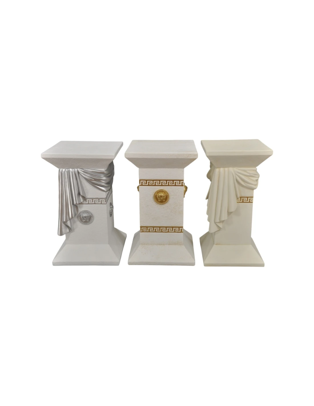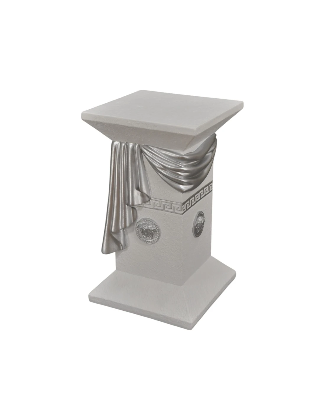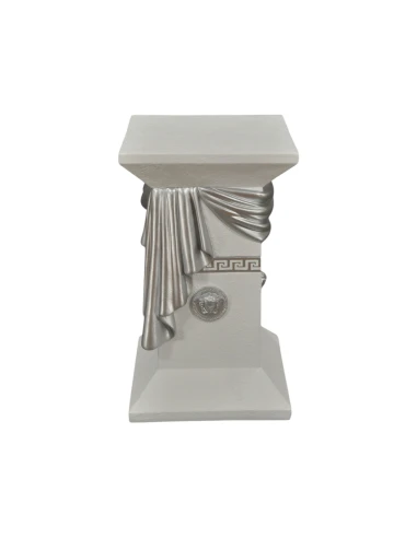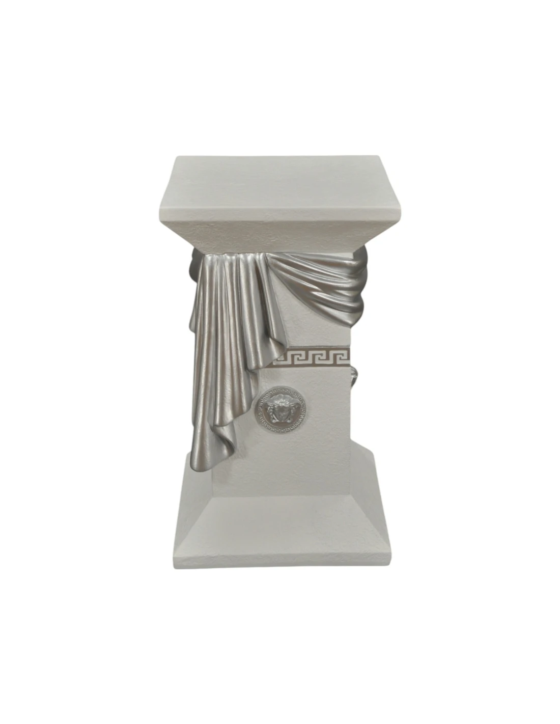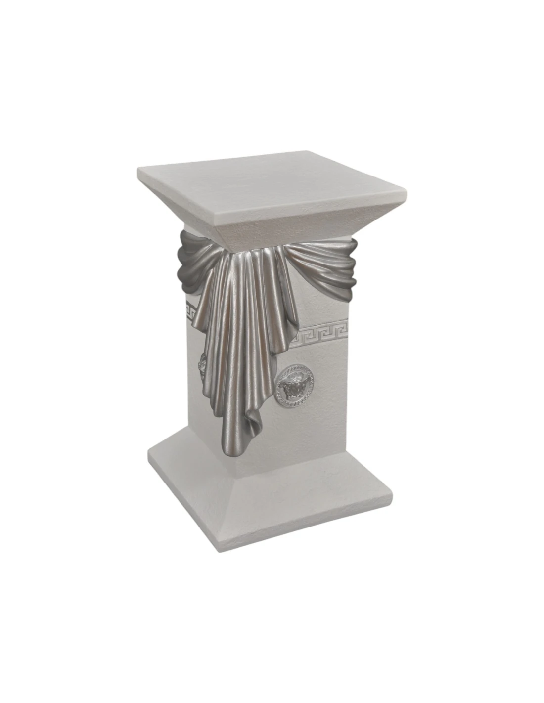 Colonne grecque blanche élégante avec draperie, reliefs décoratifs et détails argentés, H: 0,55 m