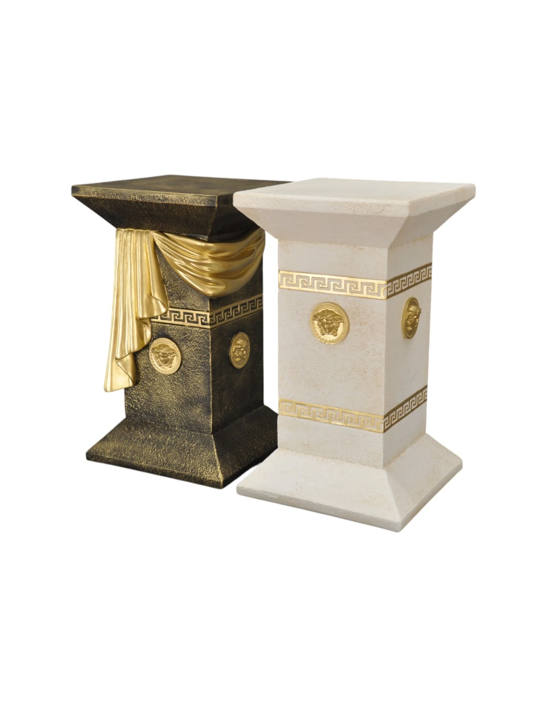 Ornez votre intérieur avec cette élégante colonne grecque blanche, une pièce qui allie harmonieusement design classique et esthétique épurée et contemporaine. Fabriquée avec soin en résine de haute qualité, cette colonne présente une finition blanche immaculée. Son draperie grise sculptée et ses reliefs décoratifs, dont une Méduse et des pièces de monnaie grecques antiques, sont rehaussés de détails argentés saisissants, ajoutant une touche de sophistication subtile et de charme historique. Mesurant 55 cm, cette colonne est un support décoratif idéal pour un vase ou une sculpture, parfait pour la maison ou un bar. Son design à la fois intemporel et moderne en fait un ajout polyvalent et élégant à tout espace.
