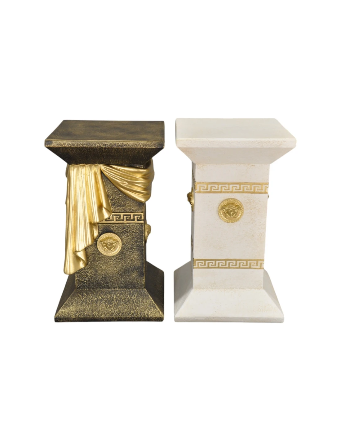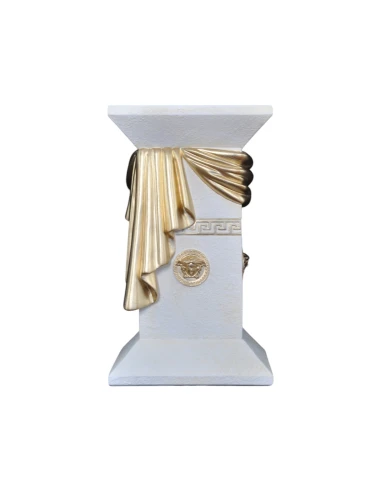 Ornez votre espace avec la colonne grecque blanche élégante, un chef-d'œuvre décoratif qui capture l'essence du luxe classique. Fabriquée en résine de haute qualité, cette colonne présente une finition blanche immaculée. Un drapé doré magnifiquement sculpté, ainsi que des reliefs décoratifs, dont un relief de Méduse et des pièces de monnaie grecques antiques, ajoutent une touche d'opulence intemporelle. Mesurant 55 cm, cette colonne est un support décoratif idéal pour un vase ou une sculpture, parfait pour une maison ou un bar. Son design élégant et raffiné en fait un ajout véritablement captivant à toute pièce.