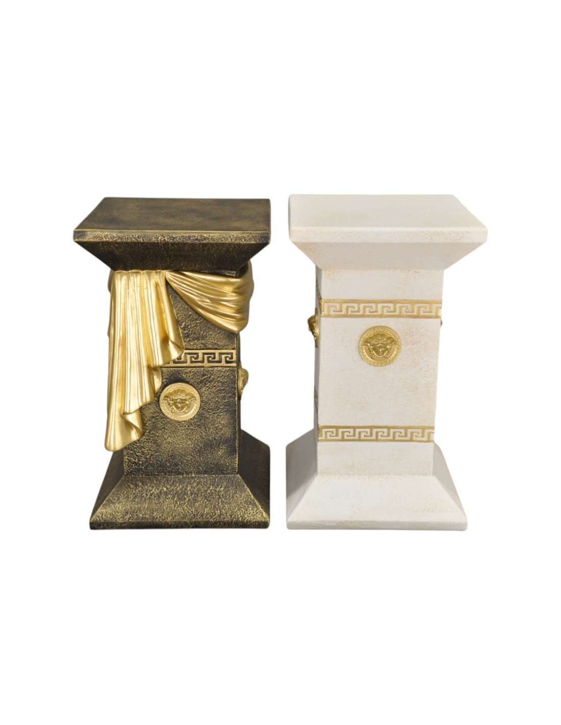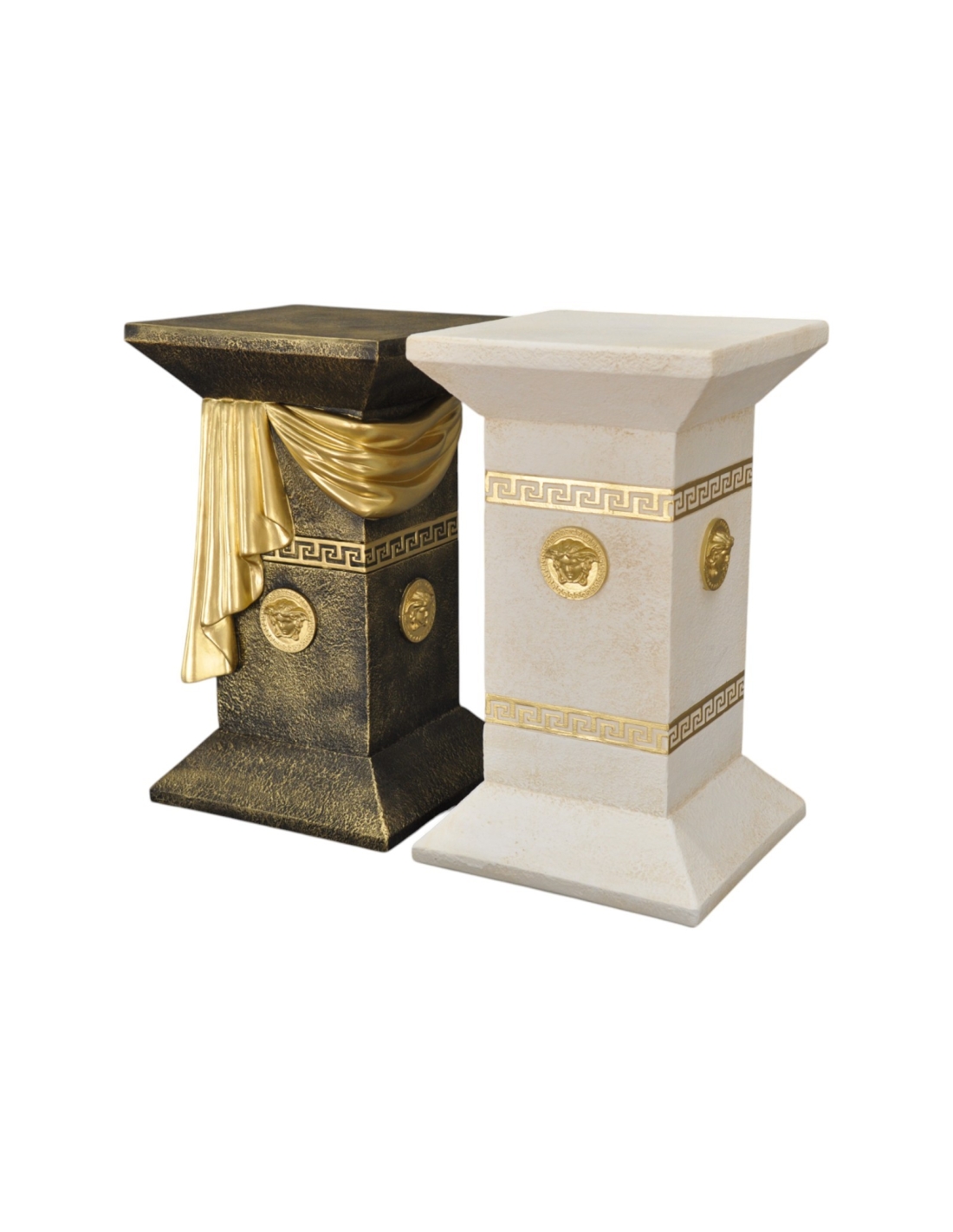 Rehaussez votre décoration avec cette élégante colonne grecque noire, une pièce raffinée alliant design classique et détails luxueux. Fabriquée en résine de haute qualité, cette colonne arbore une finition noire sophistiquée et est ornée d'un drapé magnifiquement sculpté. Ses détails dorés, dont un relief de Méduse et des pièces de monnaie grecques antiques, ajoutent une touche de luxe et de charme historique. Mesurant 55 cm, cette colonne est un support décoratif idéal pour un vase ou une sculpture, parfait pour la maison ou un bar. Son esthétique à la fois classique et opulente en fait un ajout captivant à tout espace.