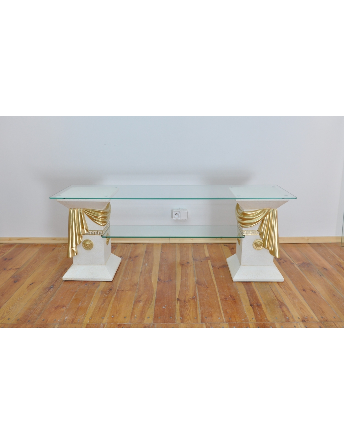 Cette élégante et discrète console de style grec est une pièce maîtresse sophistiquée conçue pour sublimer tout espace de vie. Fabriquée en résine de haute qualité, elle est dotée de deux solides bases colonnes à la finition blanche épurée et de luxueux détails dorés, dont un motif de clé grecque et une superbe ceinture drapée. Un grand plateau en verre et une étagère en verre relient les colonnes, offrant une plateforme idéale pour exposer objets décoratifs, livres ou œuvres d'art. Son design classique et intemporel en fait un ajout idéal et élégant à votre décoration intérieure.