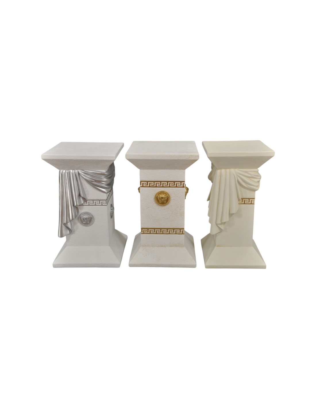 Apportez une touche d'élégance spectaculaire à votre espace avec cette élégante colonne grecque imitation marbre noir. Soigneusement réalisée en résine de haute qualité, cette colonne présente une superbe finition imitation marbre noir aux veinures subtiles. Son drapé sculpté et ses reliefs décoratifs, dont un relief de Méduse et des pièces de monnaie grecques antiques, sont rehaussés de détails dorés saisissants, créant une atmosphère d'opulence raffinée. Mesurant 55 cm, cette pièce est un support décoratif idéal pour un vase ou une statue, parfait pour la maison ou un bar. Son design à la fois classique et luxueux en fait un élément central captivant dans n'importe quelle pièce.