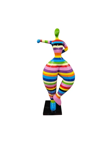 La Ballerine Nana est réalisée en résine décorative moulée, ce qui permet de restituer avec précision les formes arrondies du corps tout en gardant un poids raisonnable. Après préparation de la surface, les rayures multicolores sont peintes à la main, avec un rythme régulier des couleurs sur les jambes, le buste et les bras.