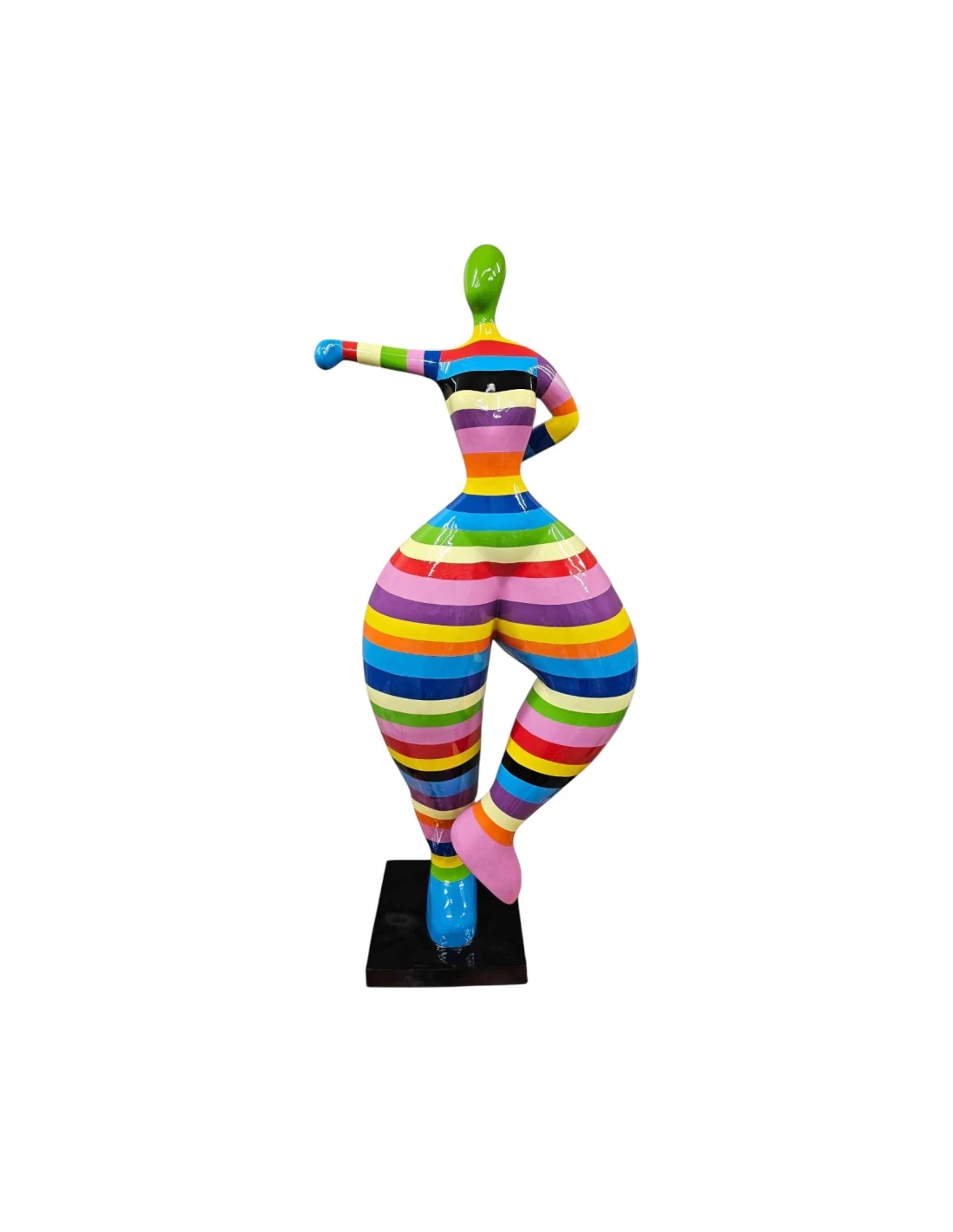 Cette figure de ballerine montre une silhouette féminine aux hanches fortement marquées dans une pose dansante et détendue. Au lieu d’un tutu classique, l’ensemble du corps est habillé de rayures horizontales arc-en-ciel qui insufflent légèreté, joie et énergie positive à la sculpture. L’absence de traits du visage et de détails fins en fait davantage un symbole de joie et d’acceptation de soi qu’un portrait d’une personne précise.