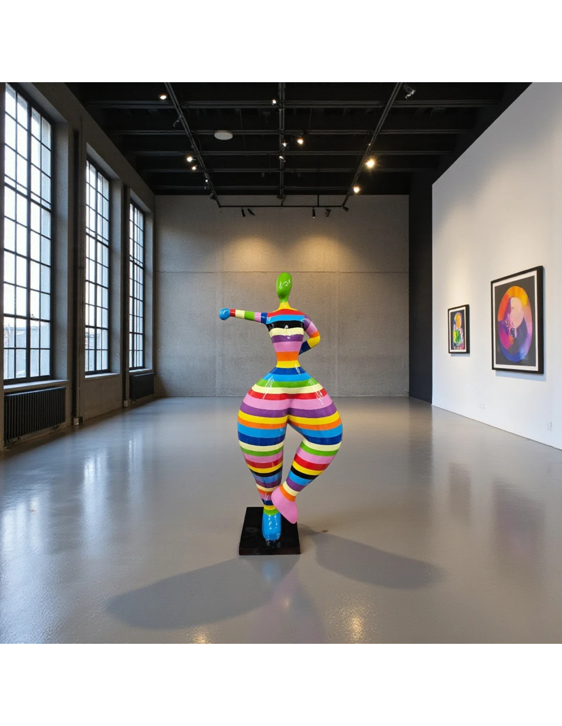Les couleurs sont vives et puissantes, bien visibles même de loin, ce qui permet à la figure de jouer le rôle d’un accent chromatique fort. Elle dynamise les intérieurs neutres en blanc, gris ou beige et attire naturellement le regard des visiteurs.