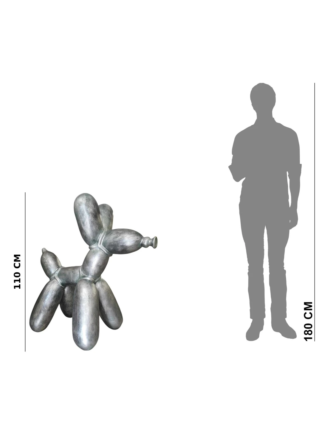 Cette figure Chien Ballon revisite la forme classique Balloon Dog avec une finition argentée métallisée. La silhouette ballon aux formes douces et « gonflées » contraste avec l’effet métal industriel, donnant une sculpture à la fois légère et visuellement plus « massive ». La teinte argentée et ses nuances évoquent l’acier brut, les structures de loft et les codes du design industriel.