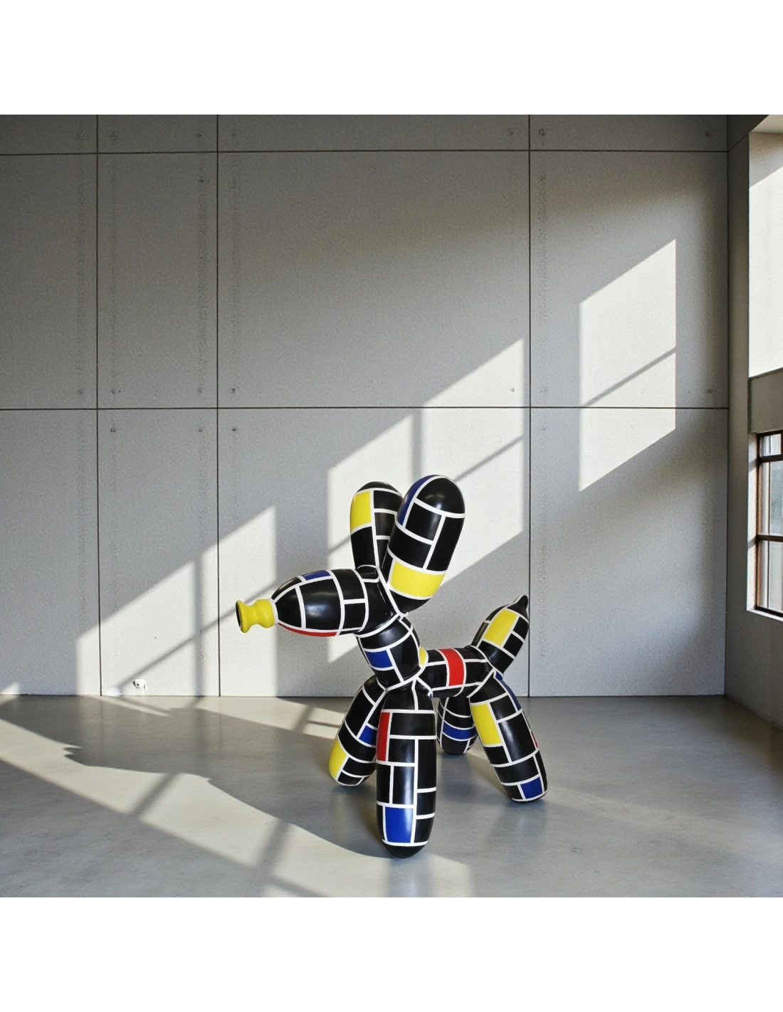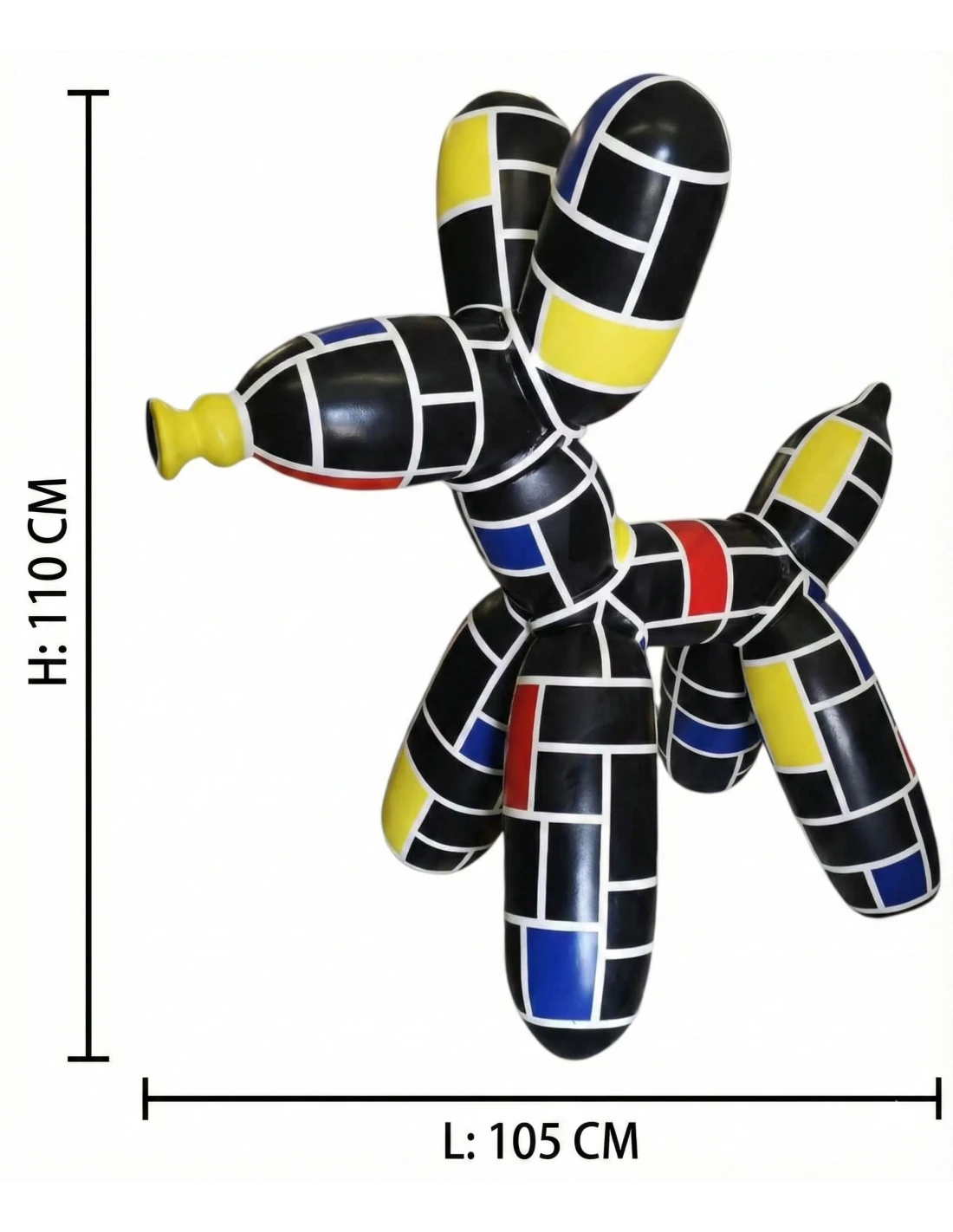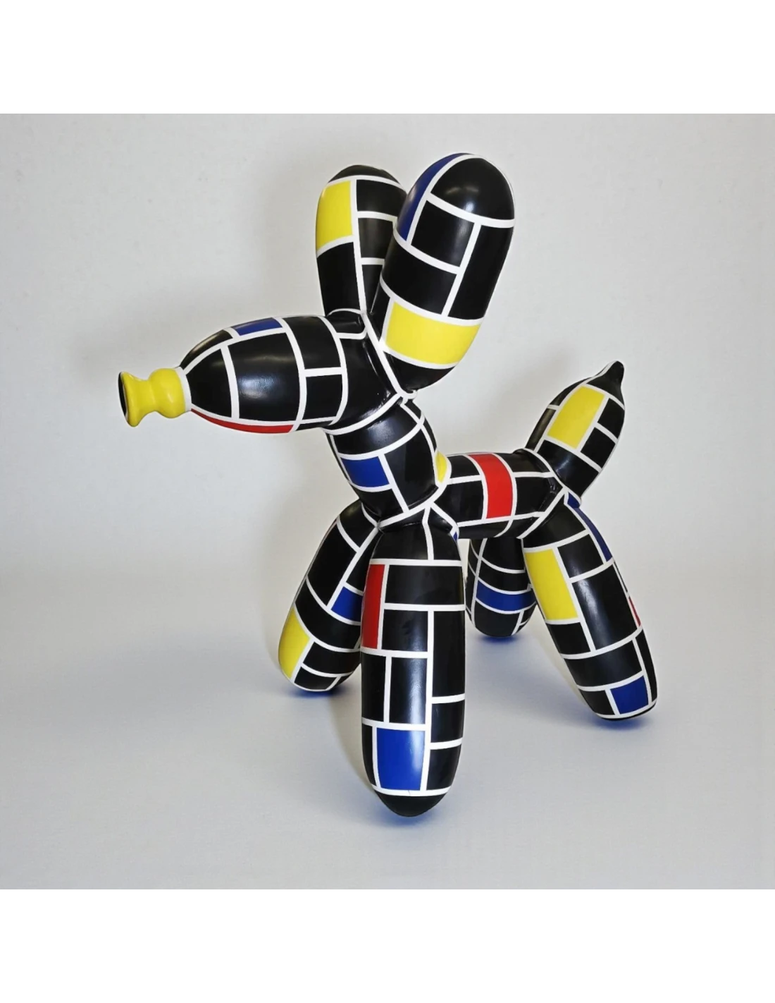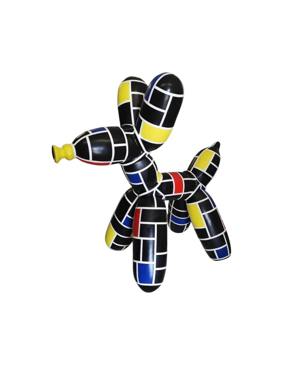 La figurine Chien Pop Art Balloon Dog style Mondrian ressemble à une sculpture sortie d’une galerie d’art contemporain. Le corps noir brillant, recouvert d’une grille géométrique de blocs jaunes, rouges et bleus, attire le regard sous tous les angles et donne immédiatement du caractère à la pièce.