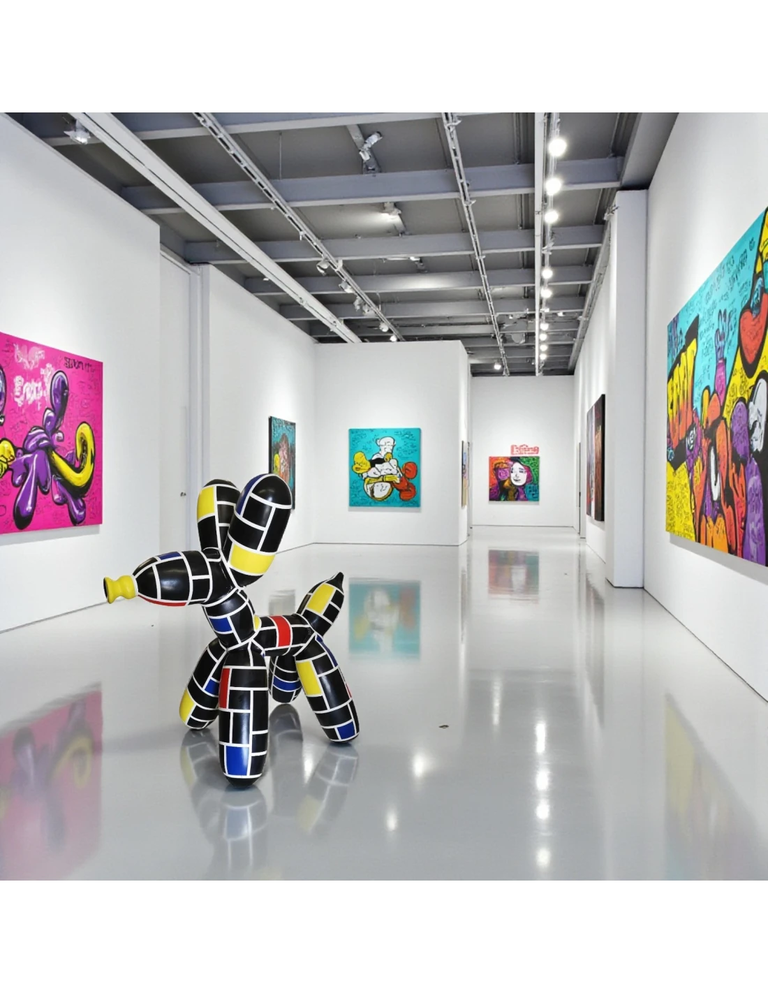 Le Balloon Dog façon Mondrian s’intègre parfaitement dans les intérieurs modernes, minimalistes, loft ou éclectiques, où il joue le rôle d’accent artistique fort. Il se démarque sur des murs blancs, gris ou aspect béton, mais aussi dans des espaces colorés inspirés du Pop Art. Il attirera les regards dans un salon, un bureau, une chambre d’ado, un showroom ou un espace de travail créatif. Il se marie très bien avec d’autres figurines Pop Art, des affiches graphiques et un éclairage contemporain.