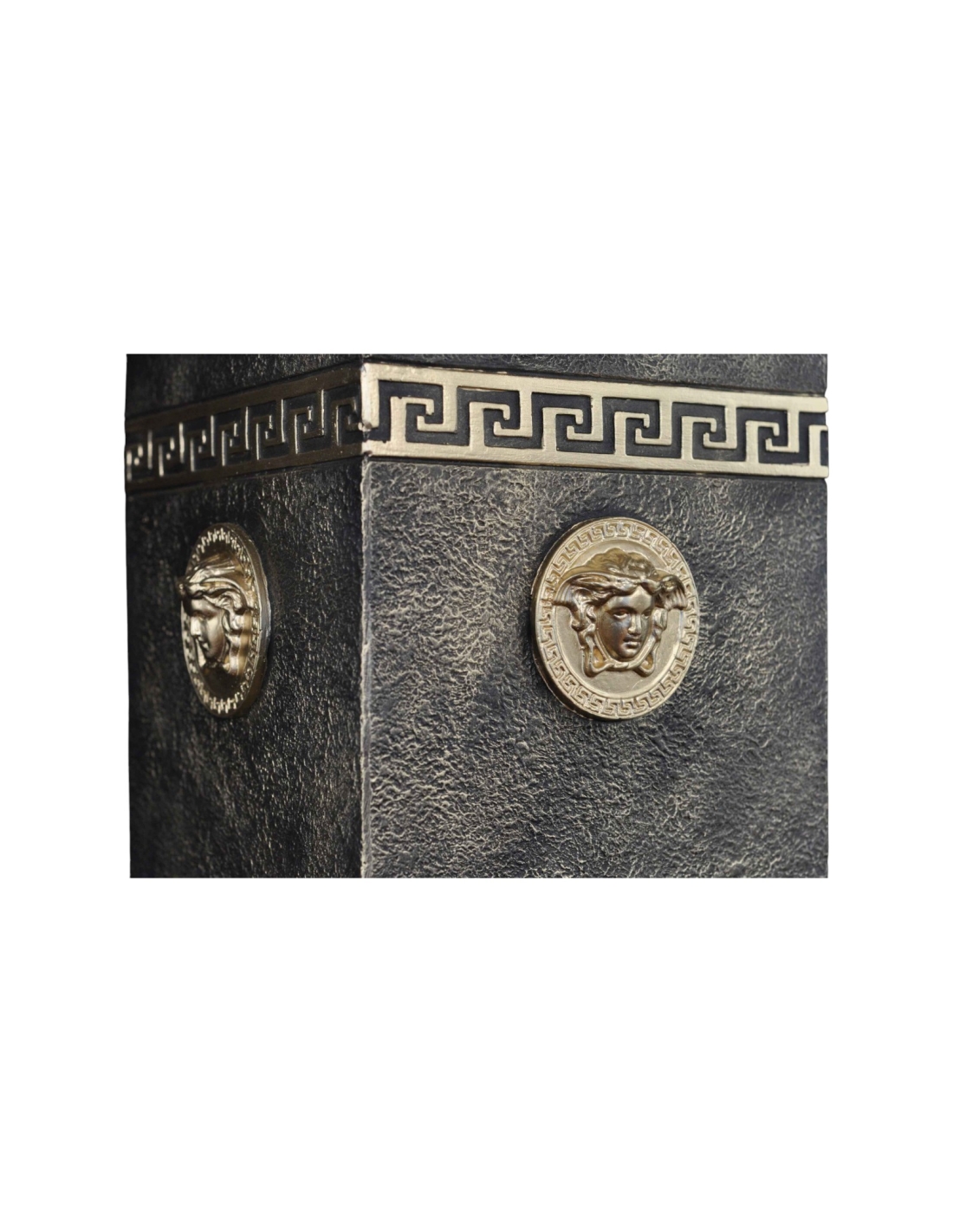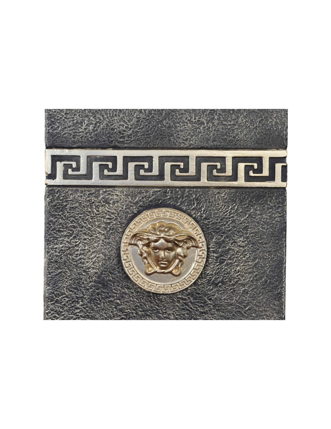 Voici la luxueuse colonne grecque noire avec reliques et ornements dorés représentant la Méduse, une pièce audacieuse et sophistiquée. Soigneusement réalisée en résine de haute qualité, cette colonne présente une riche finition noire rehaussée de détails dorés complexes et de fascinants reliefs représentant la Méduse. Son style grec classique est rehaussé par des ornements supplémentaires en forme de pièces de monnaie grecques antiques, ajoutant une touche historique unique. D'une hauteur d'un mètre, cette colonne robuste et élégante est un élément décoratif idéal pour une maison ou un bar, alliant grandeur antique et luxe moderne.