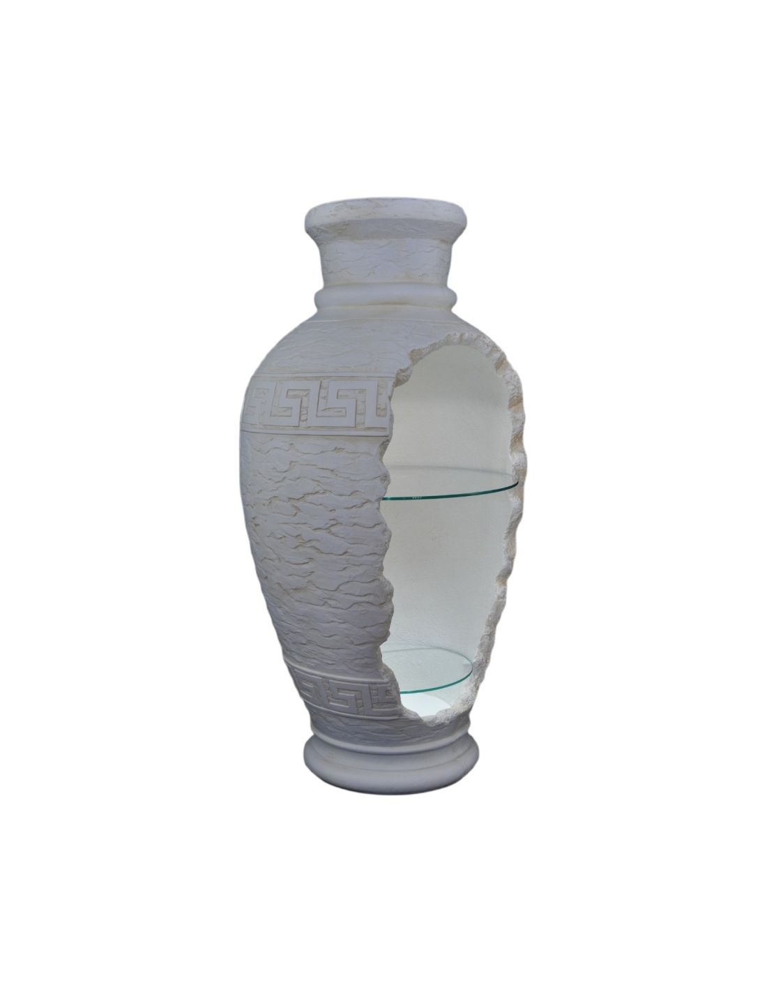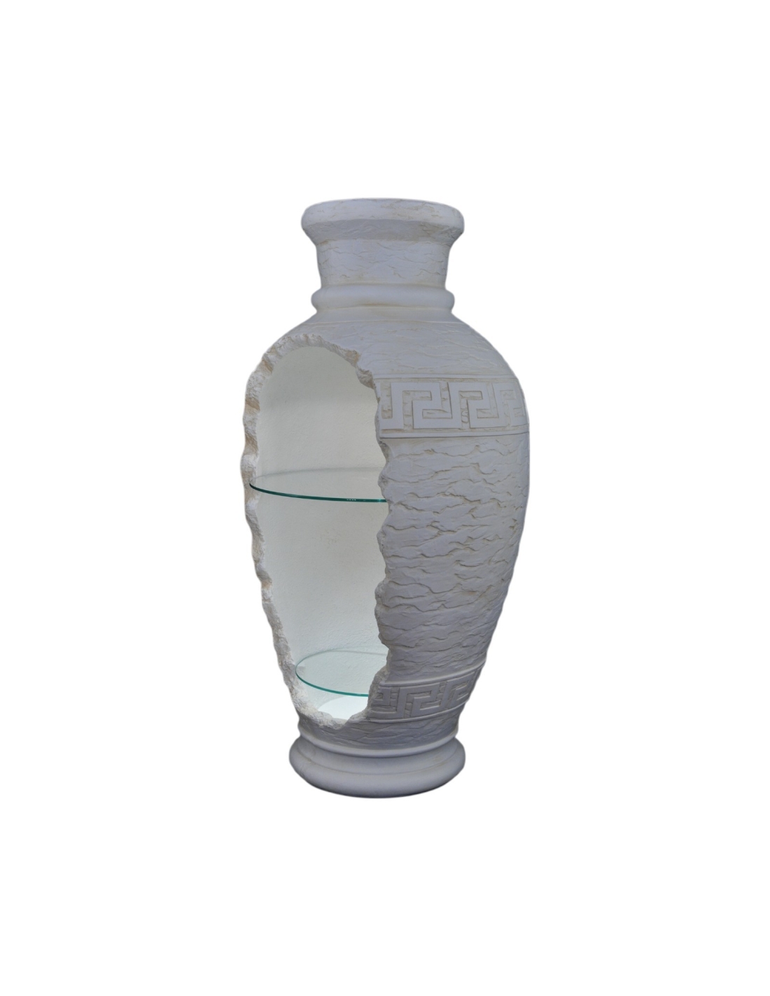 Cette vitrine amphore sophistiquée de style grec est une pièce décorative et fonctionnelle pour votre intérieur. D'une hauteur de 102 cm, elle est méticuleusement fabriquée en résine de haute qualité avec une finition blanche classique, mettant en valeur un subtil motif grec. Son design unique « brisé » révèle un intérieur fonctionnel avec des étagères (suggérées par des modèles similaires précédents), idéal pour mettre en valeur vos objets décoratifs ou votre verrerie préférés. Avec ses détails raffinés et son élégance, cette pièce est conçue pour apporter une touche raffinée à tout intérieur.