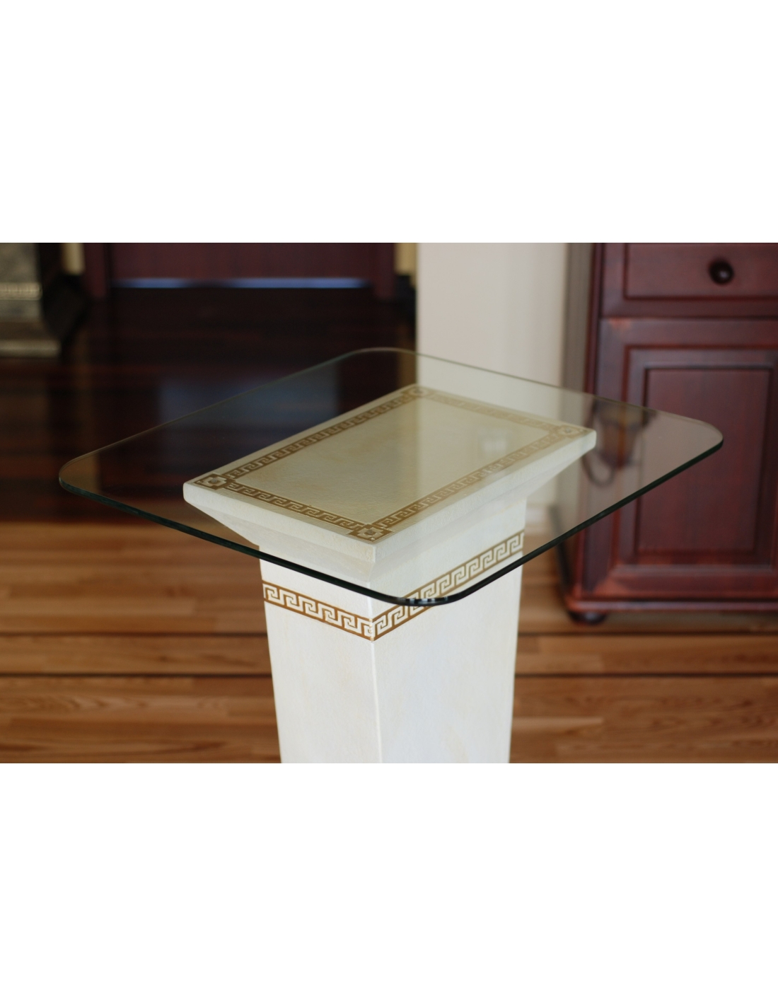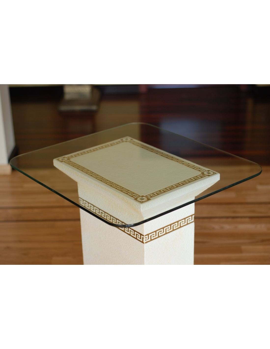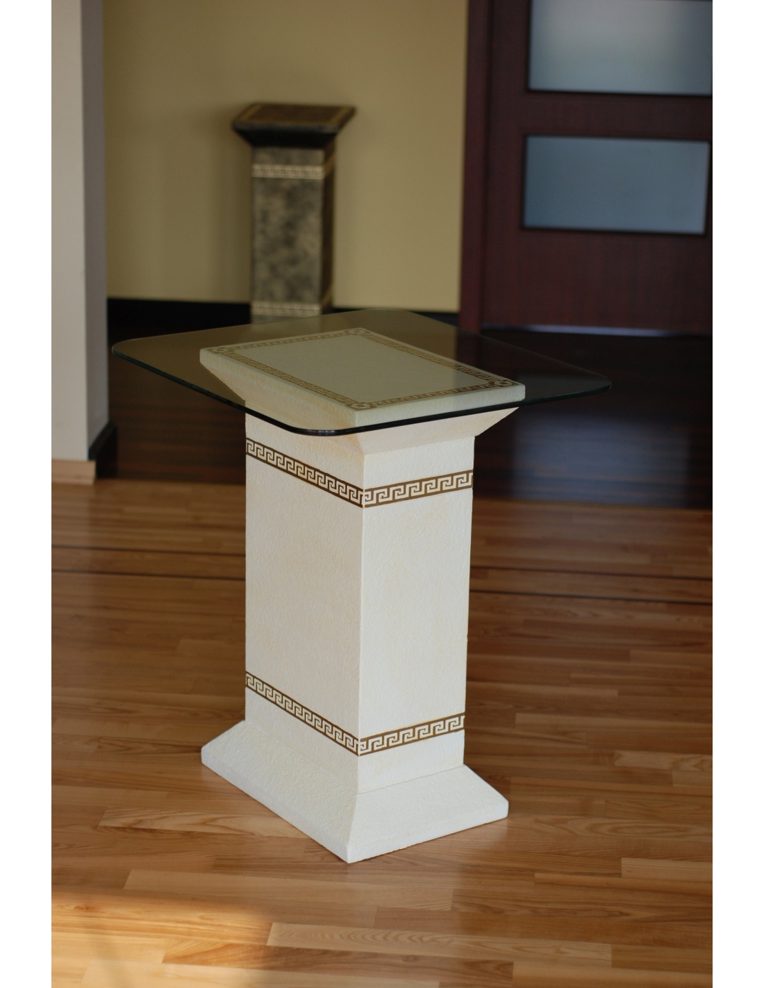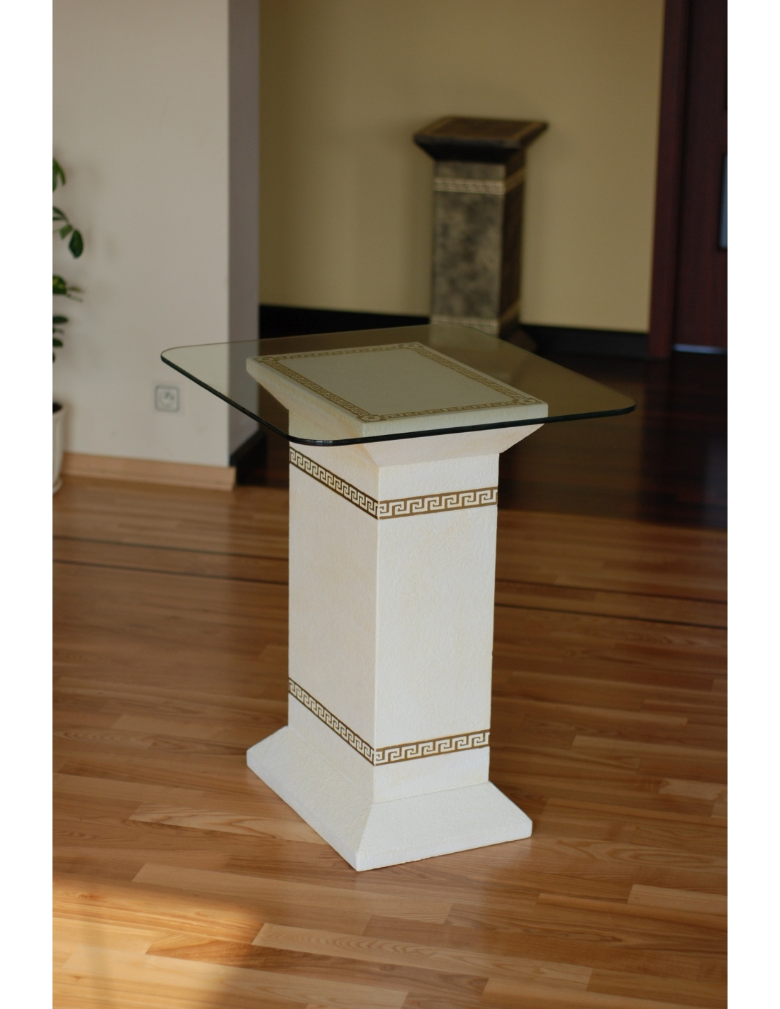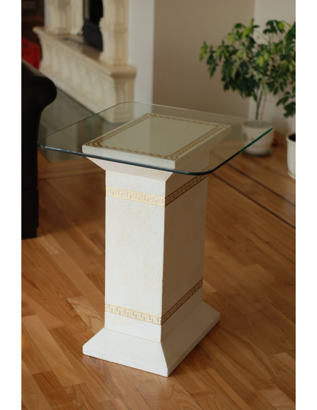 Cette élégante table à piédestal de style grec allie à la perfection design classique et fonctionnalité pour votre intérieur. Elle est dotée d'une base robuste en résine de haute qualité, d'une finition blanche éclatante et de luxueux détails dorés, dont un subtil motif de clé grecque. Un plateau en verre transparent repose gracieusement sur le piédestal, offrant une surface idéale pour exposer des objets décoratifs, une lampe ou une petite plante. Avec son élégance intemporelle et son souci du détail, cette table est une pièce d'appoint idéale pour ajouter une touche de sophistication classique à tout intérieur.