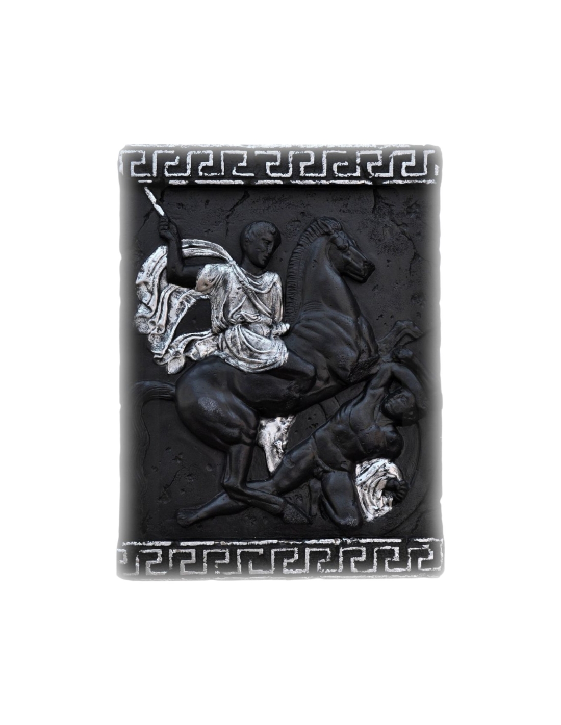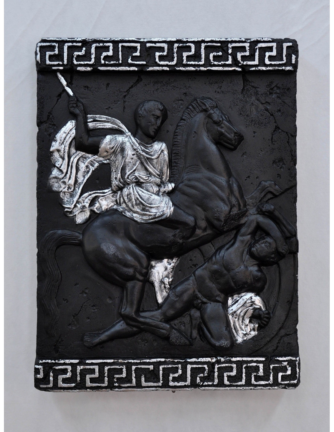 Rehaussez votre espace intérieur ou extérieur avec ce superbe bas-relief, mélange parfait de styles grec et classique. Fabriquée en résine durable de haute qualité, cette pièce représente une puissante figure à cheval, prête à apporter une touche artistique intemporelle à votre maison, bar ou jardin. Ses détails noirs et argentés créent un contraste saisissant, tandis que sa conception résistante aux intempéries lui permet de résister aux intempéries. Ajoutez une œuvre d'art aussi résistante que belle à votre collection.