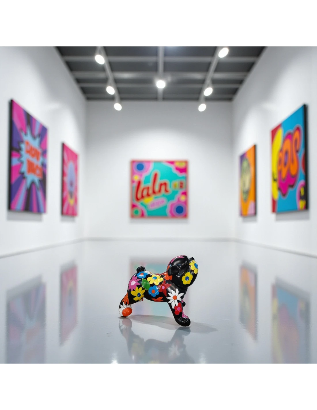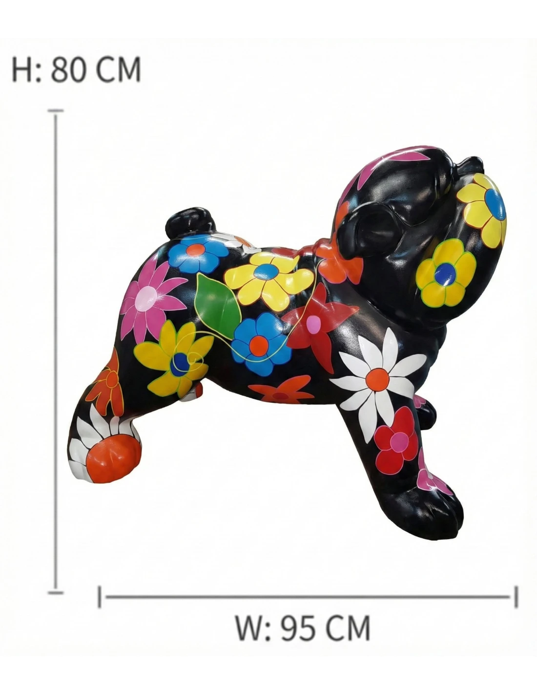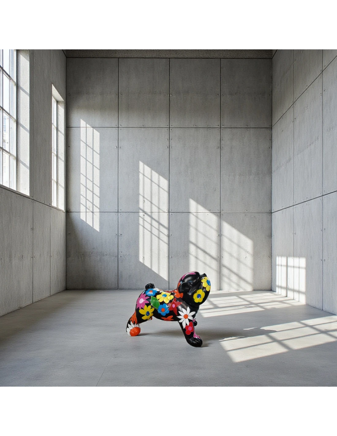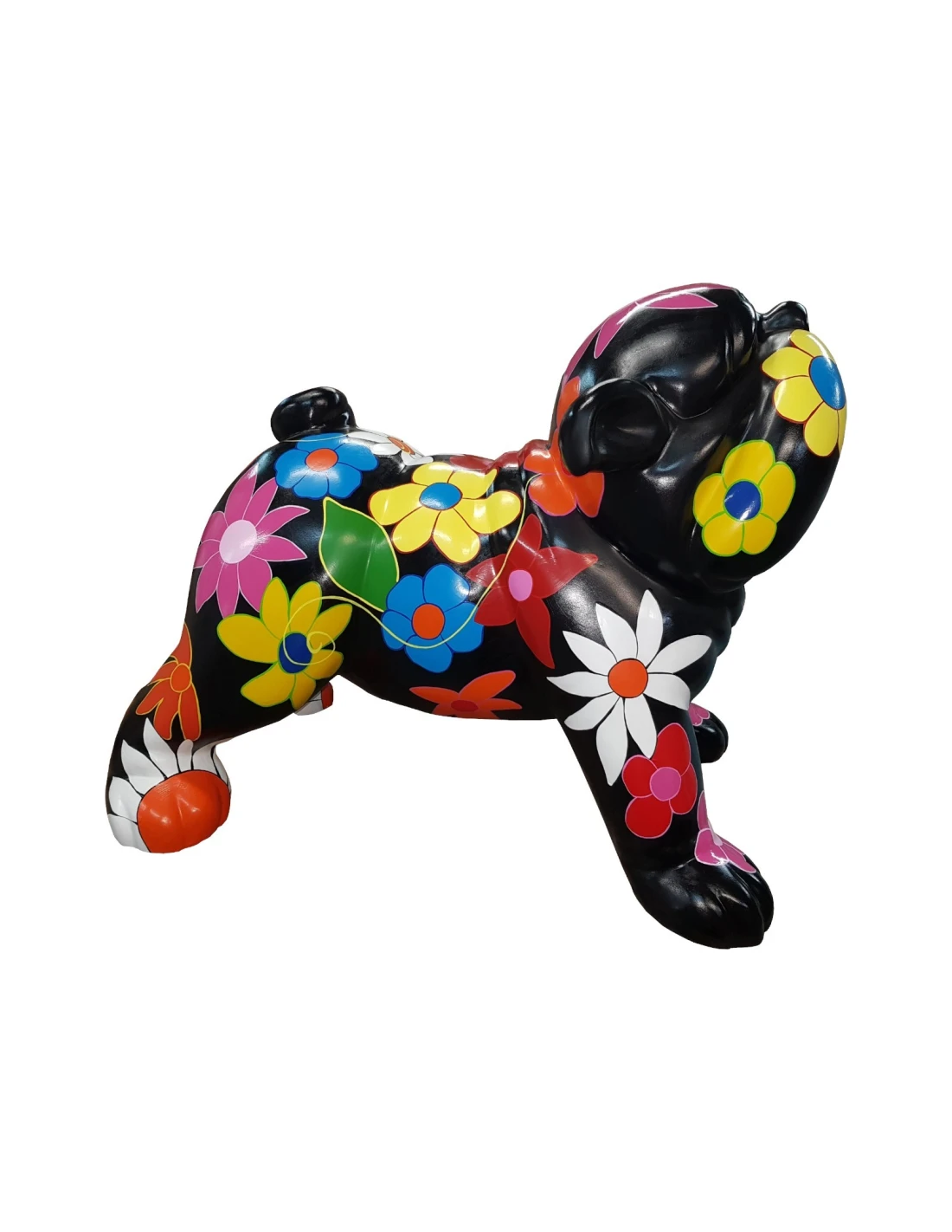 Sculpture Chien Bulldog Pop-Art Boho Flowers noir multicolore haute brillance résine