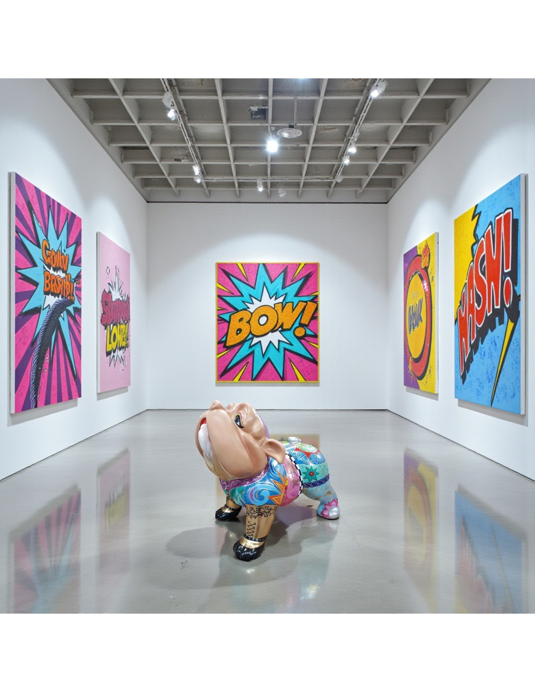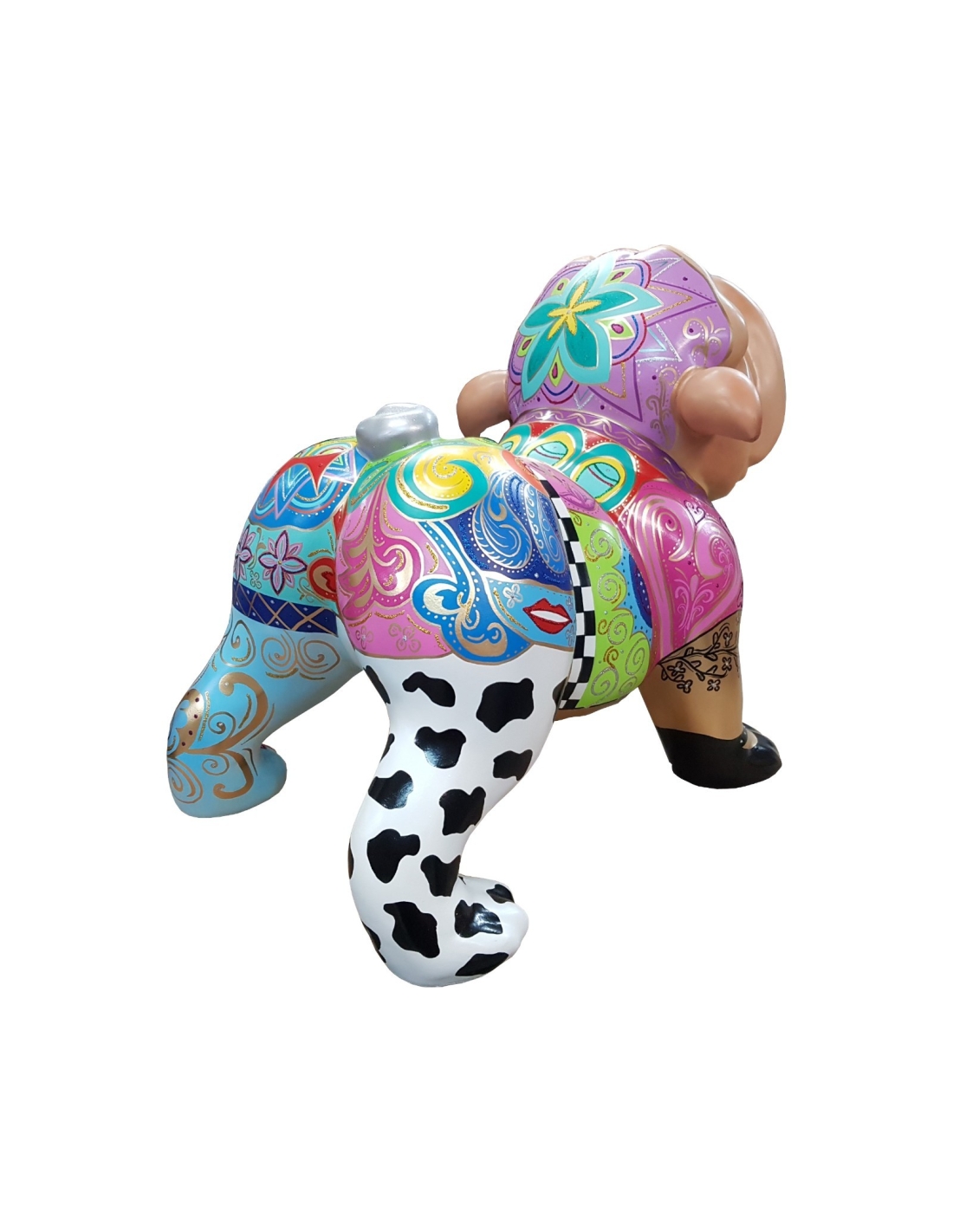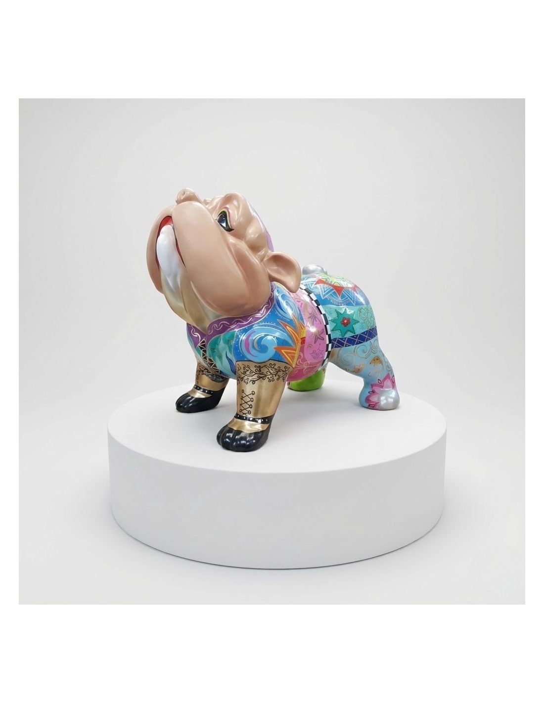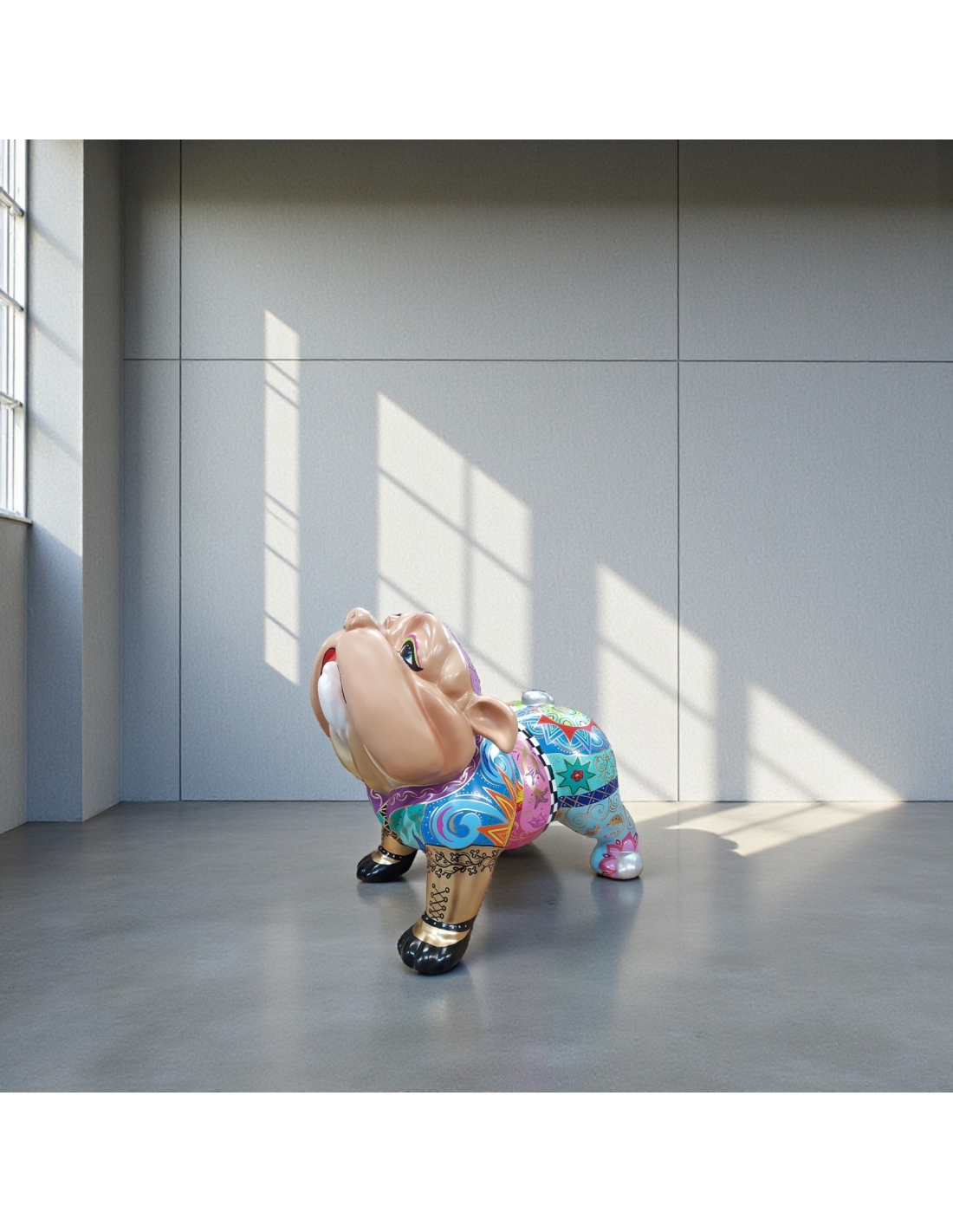 Sculpture Chien Bulldog Pop-Art Boho Patchwork pastel multicolore style moderne résine haute brillance H: 80cm