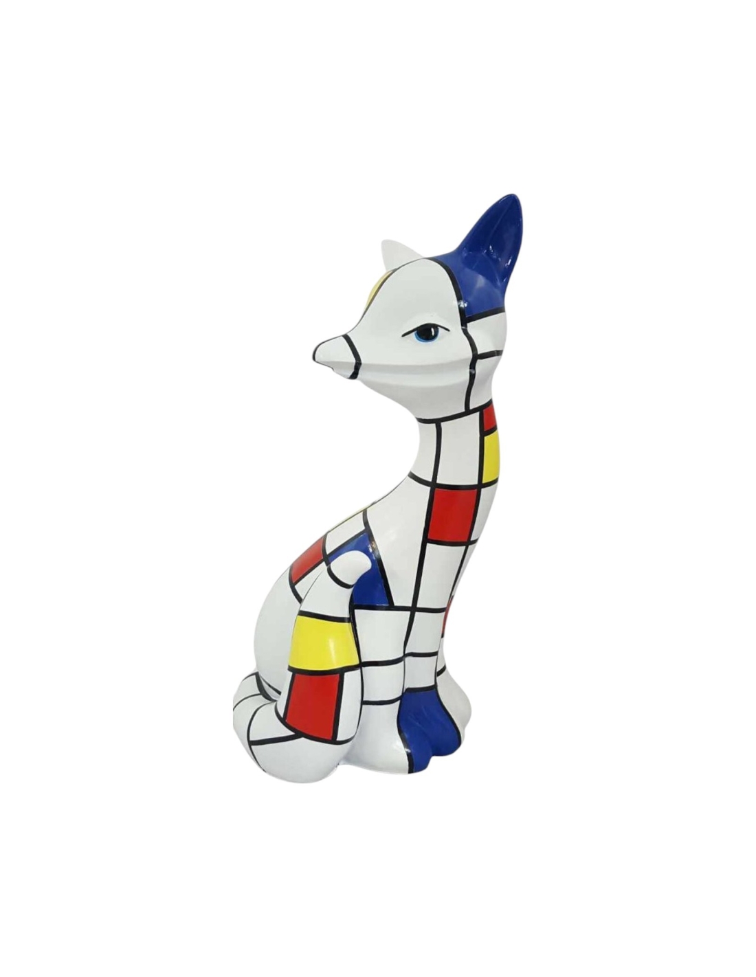 Sculpture Renard Pop-Art Stripe Marine Blue Blanc-Bleu-Noir Haute Brillance Résine H: 60cm