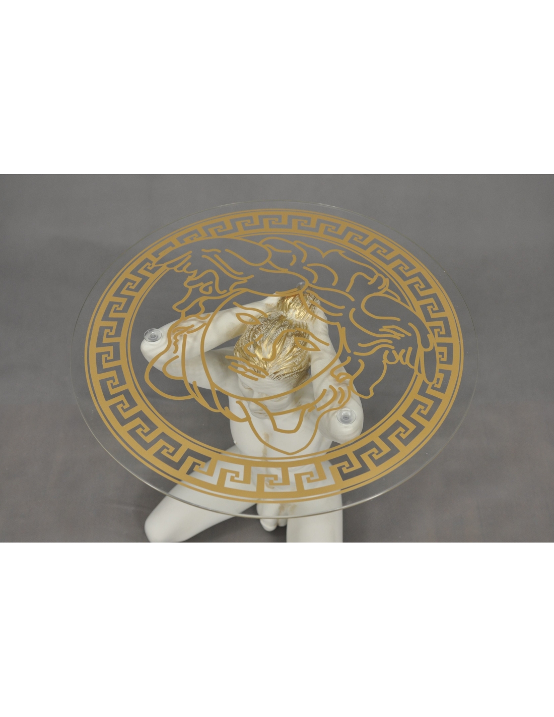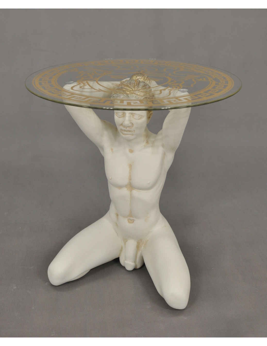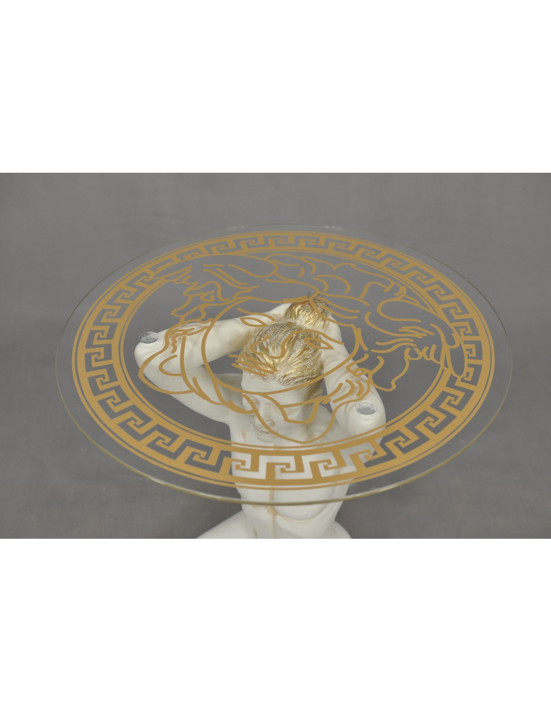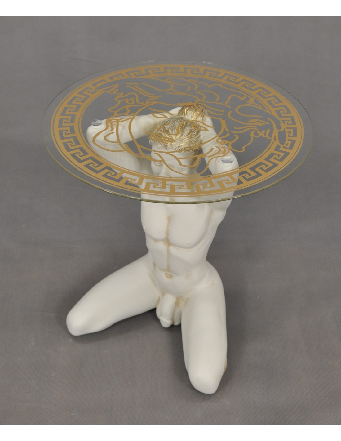 Table avec statue dhomme nu blanc, ornements dorés, style antique, plateau en verre, H : 0,5 m