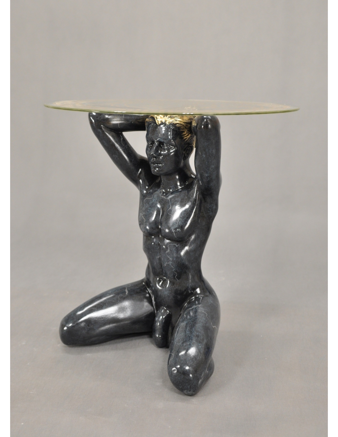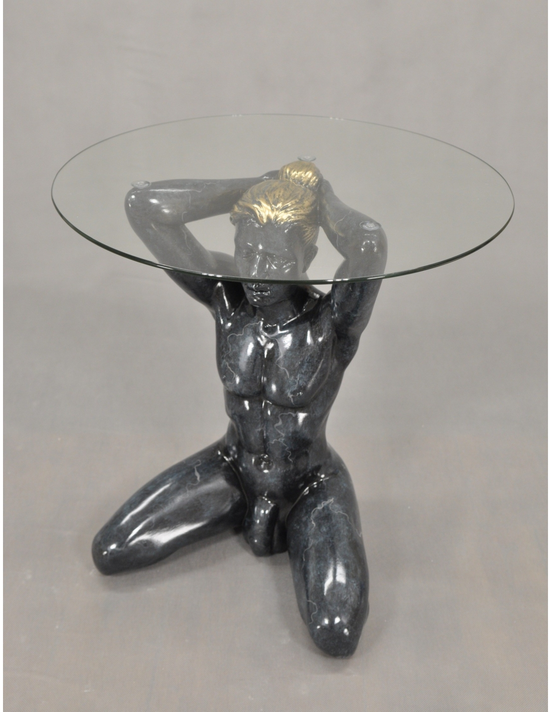 Table avec statue d'homme nu noir, style antique, plateau en verre, H : 0,5 m