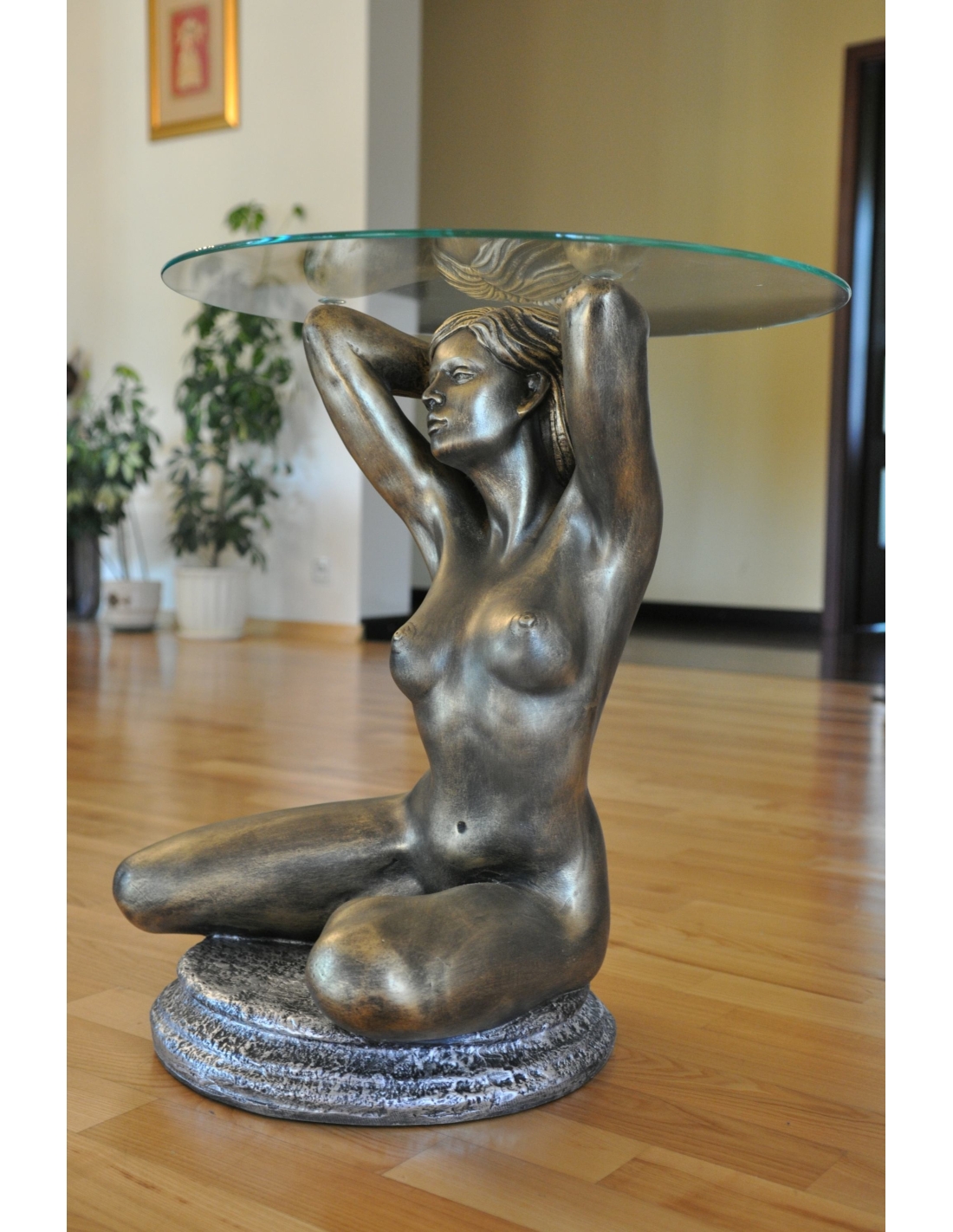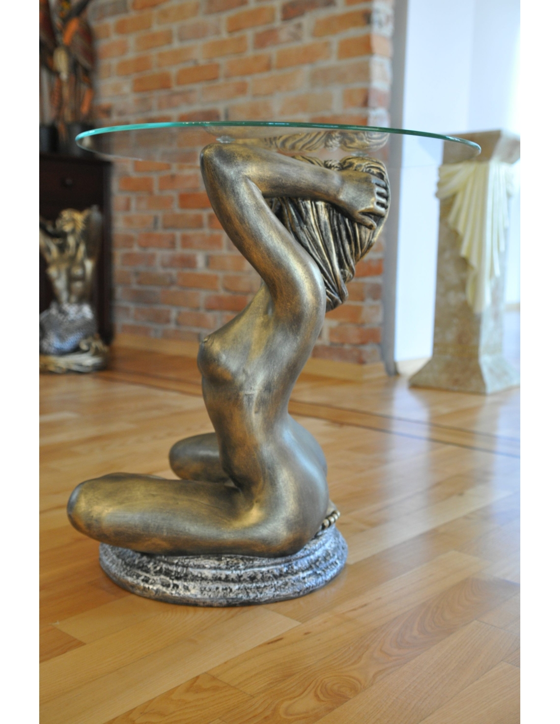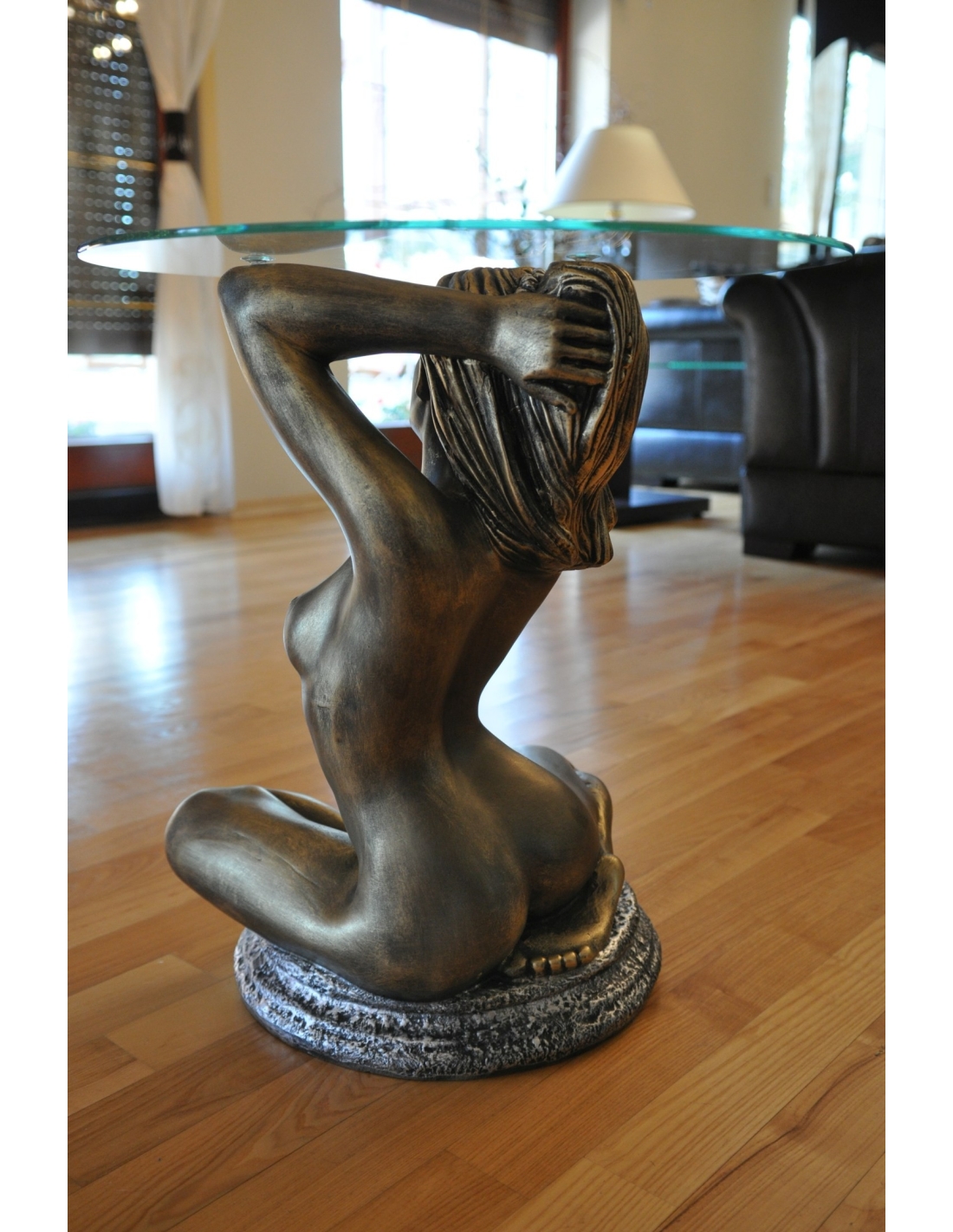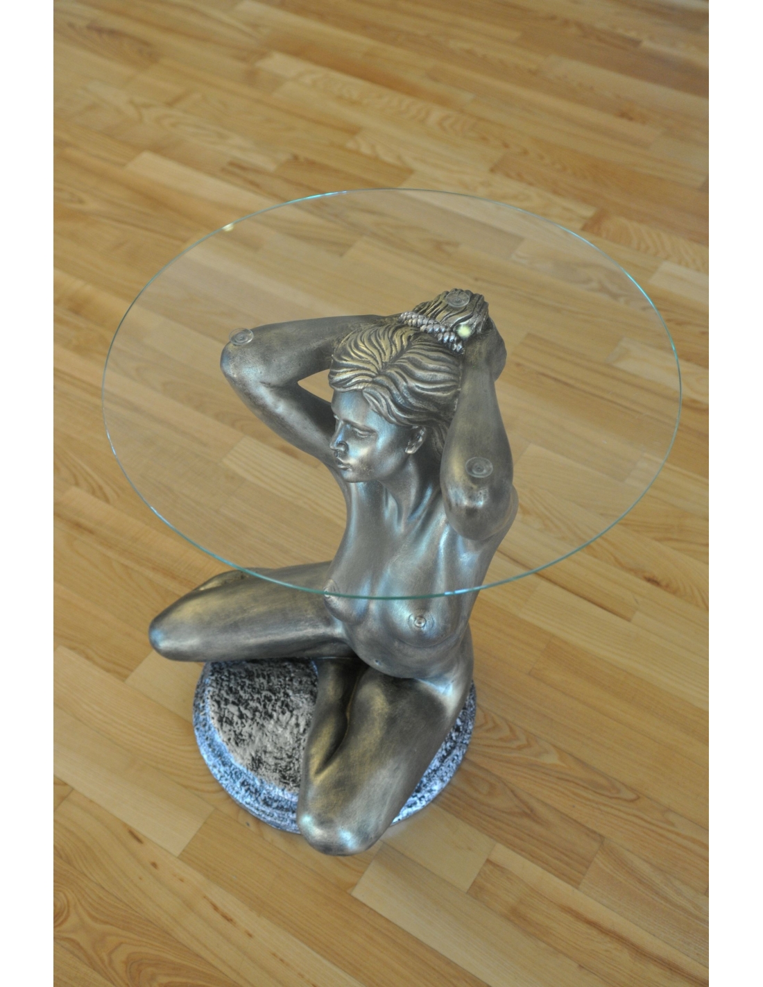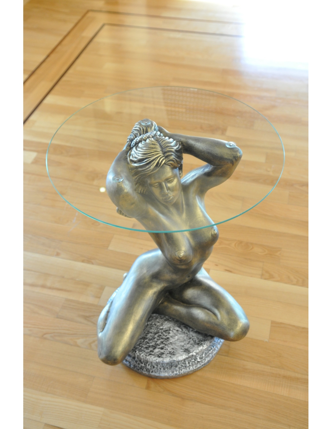 Table basse avec statue de femme, plateau ovale en verre, H : 0,5 m