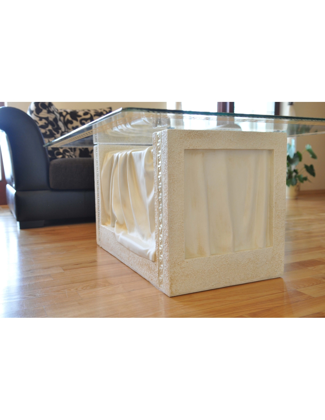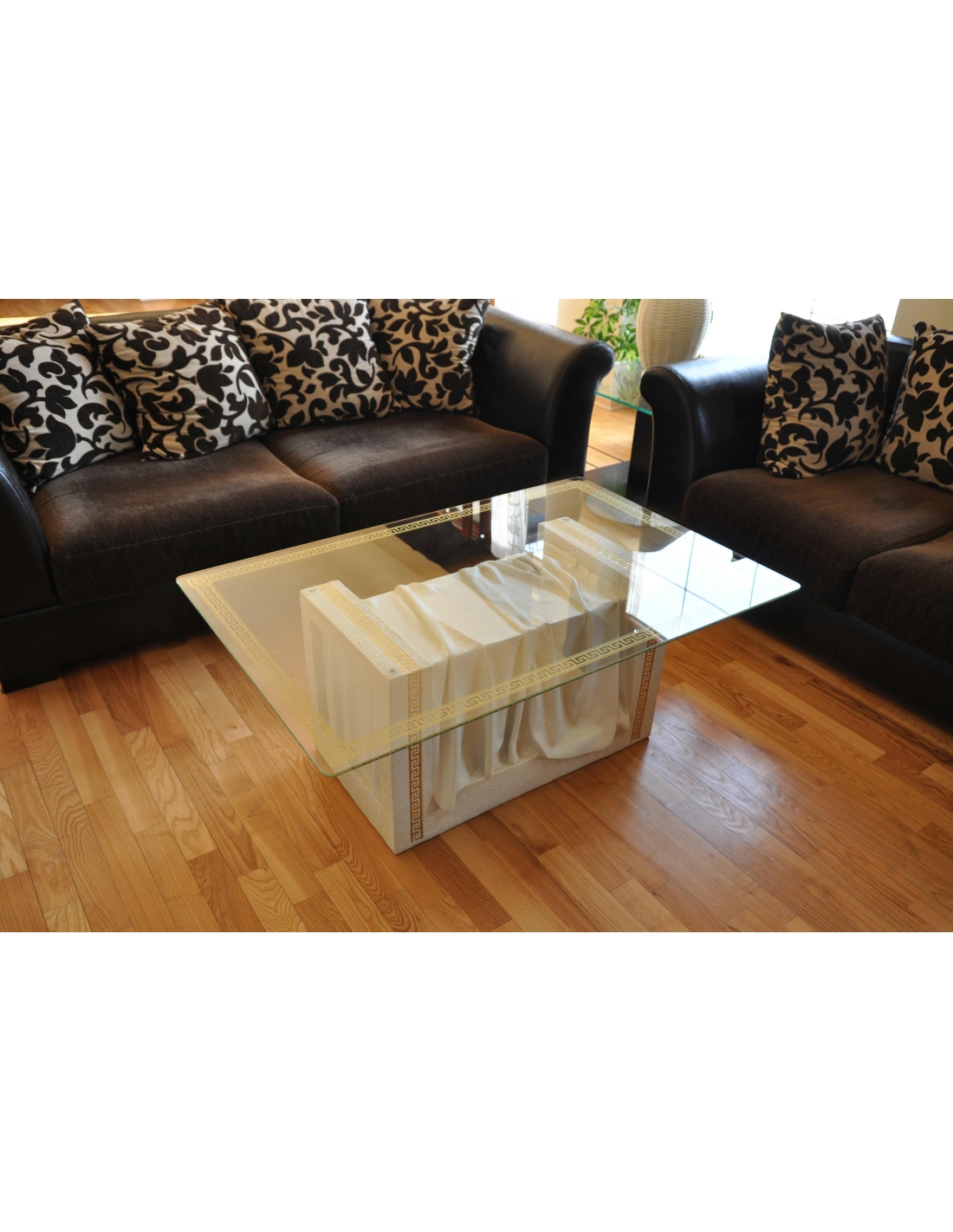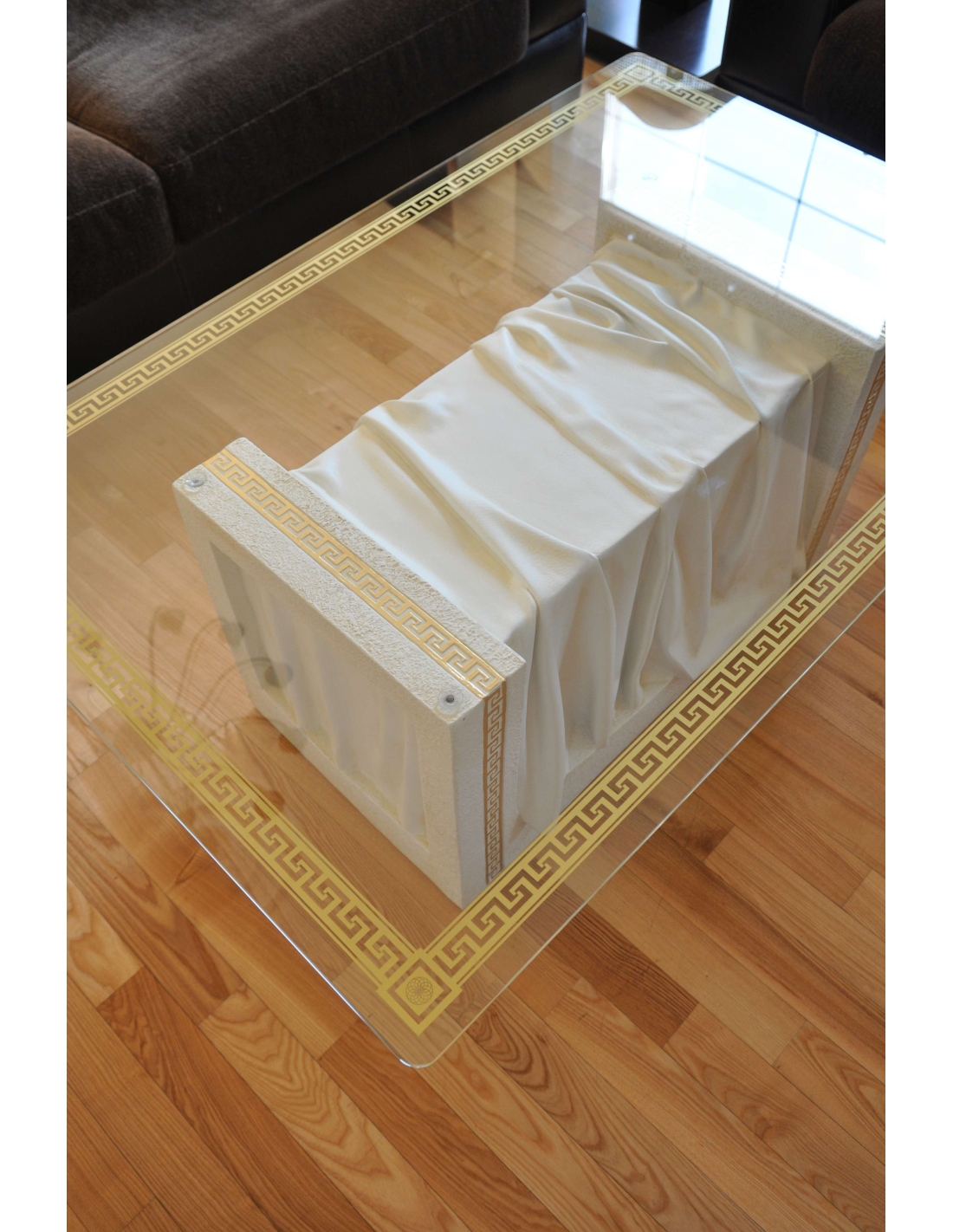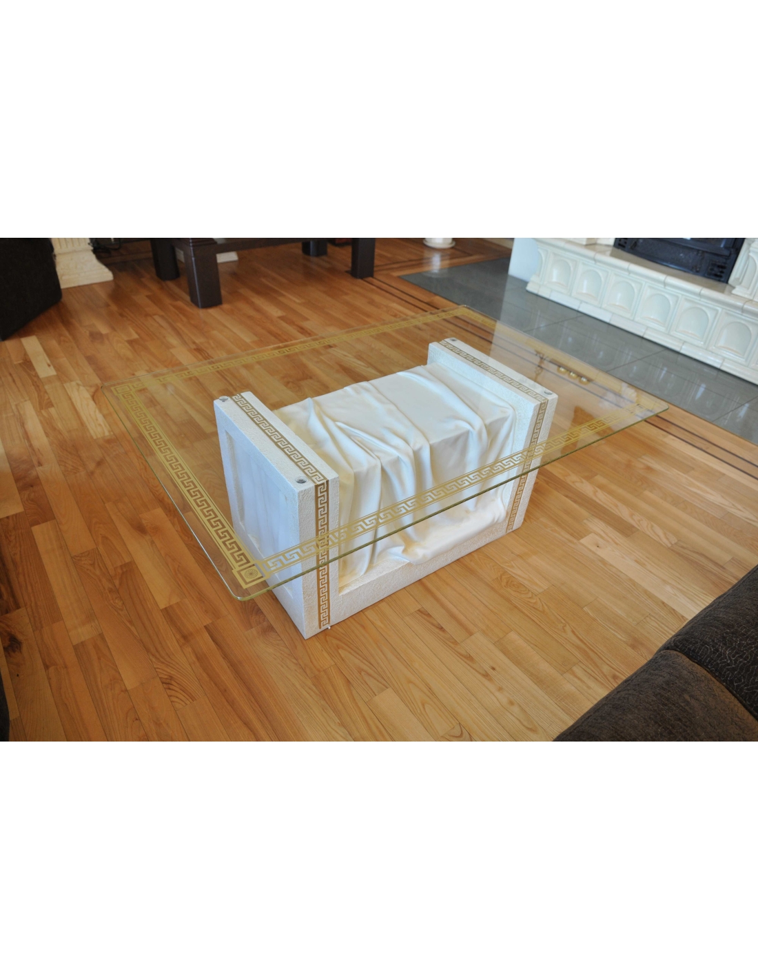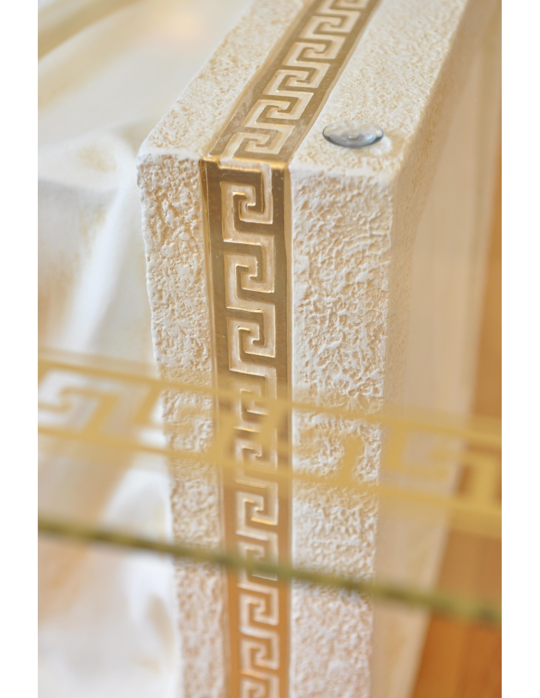 Table basse blanche, style grec, plateau rectangulaire en verre à motifs dorés, H : 0,4 m