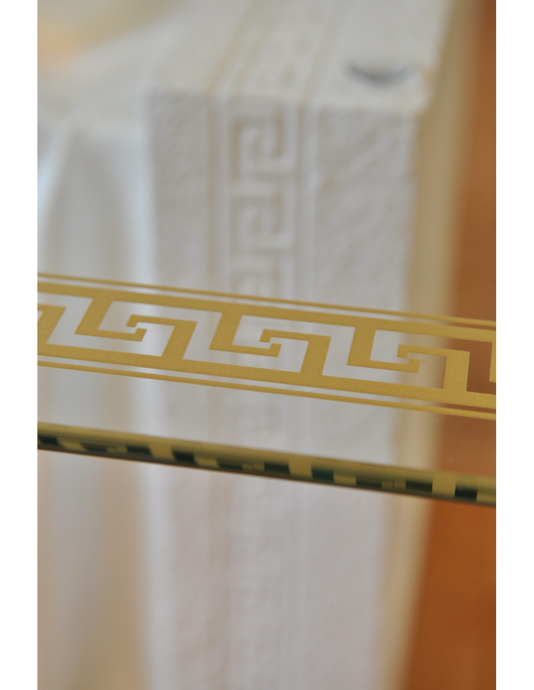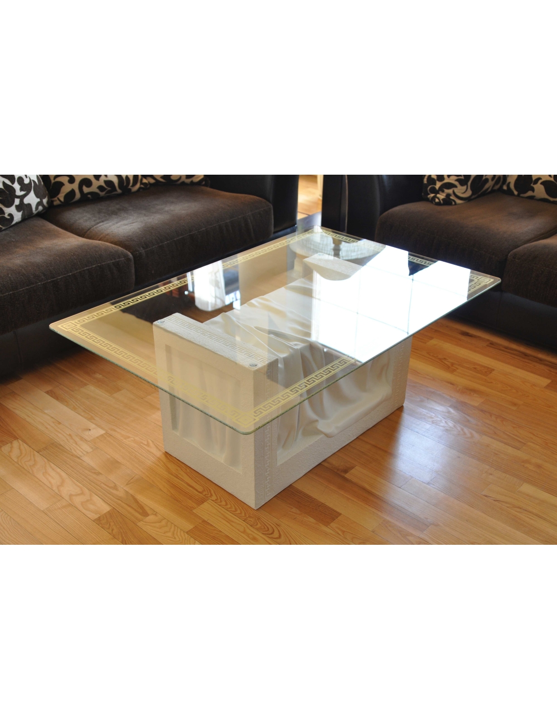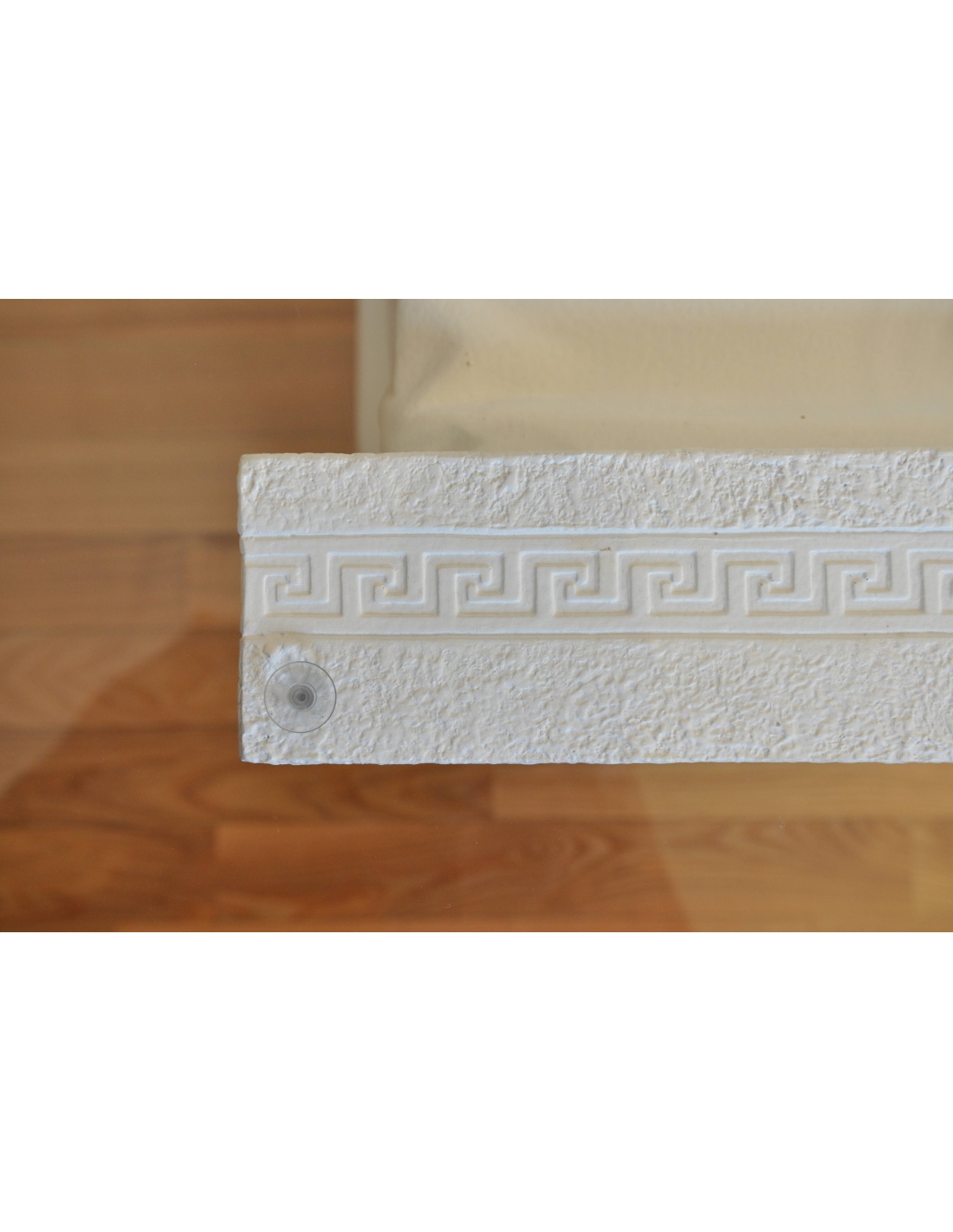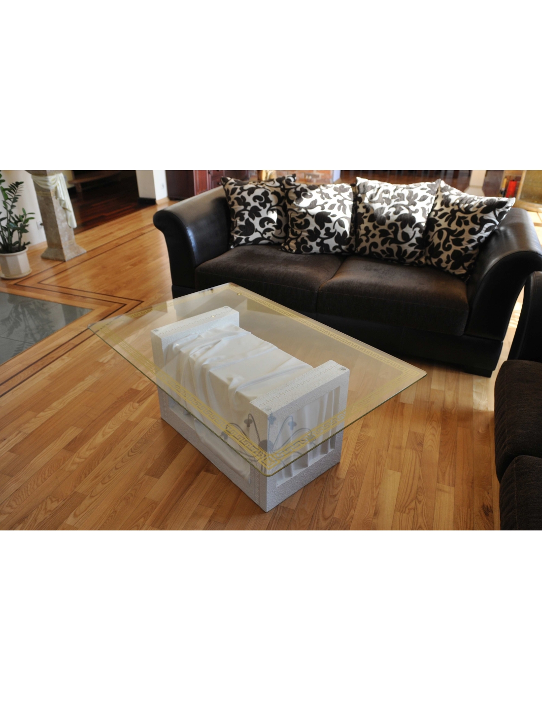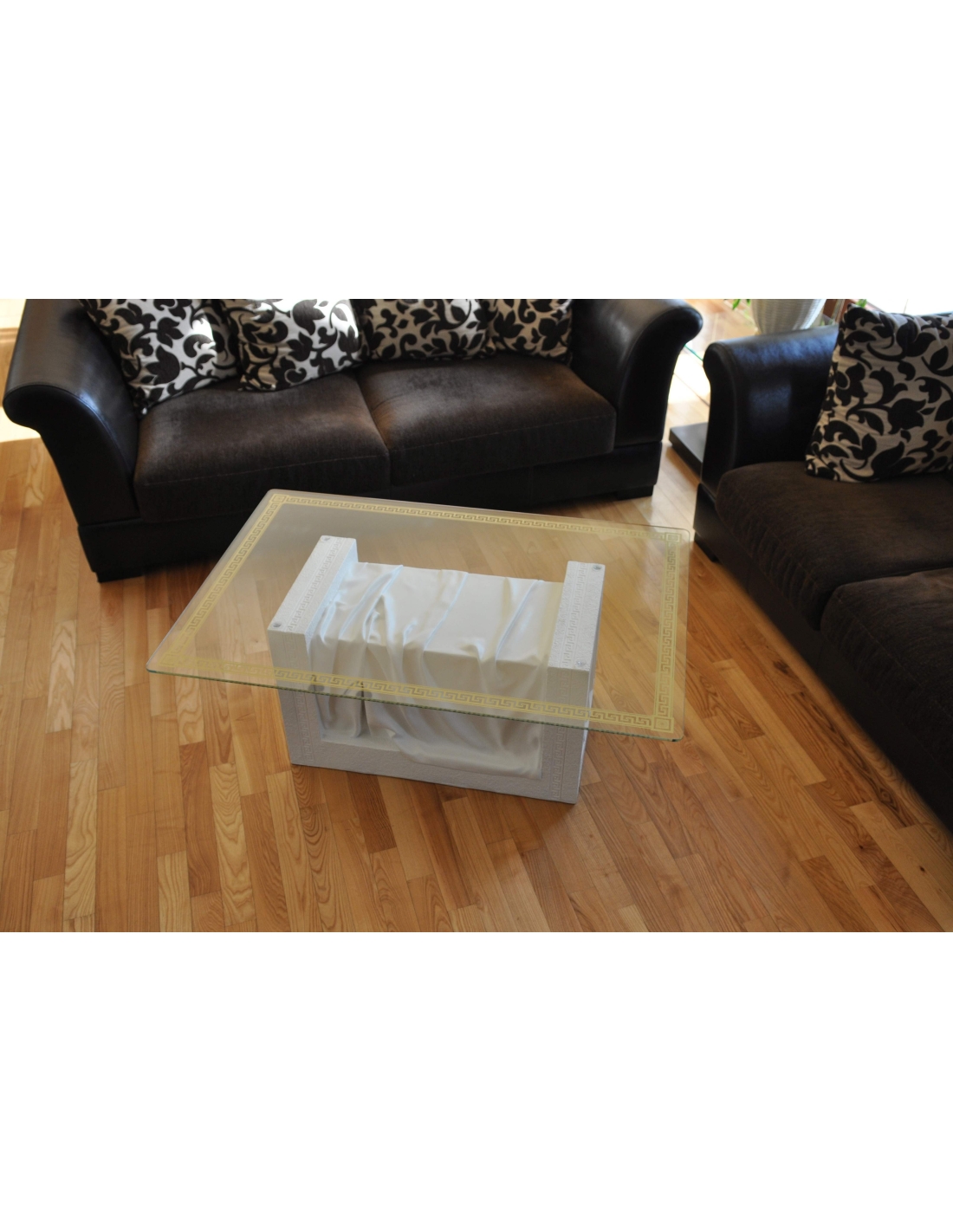 Table basse de style grec, plateau rectangulaire en verre à motif antique, H : 0,4 m