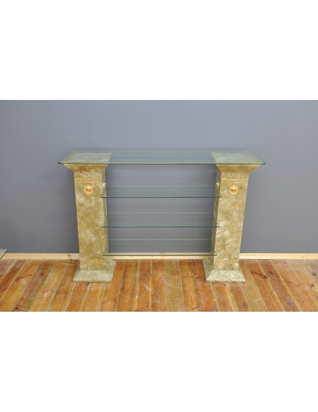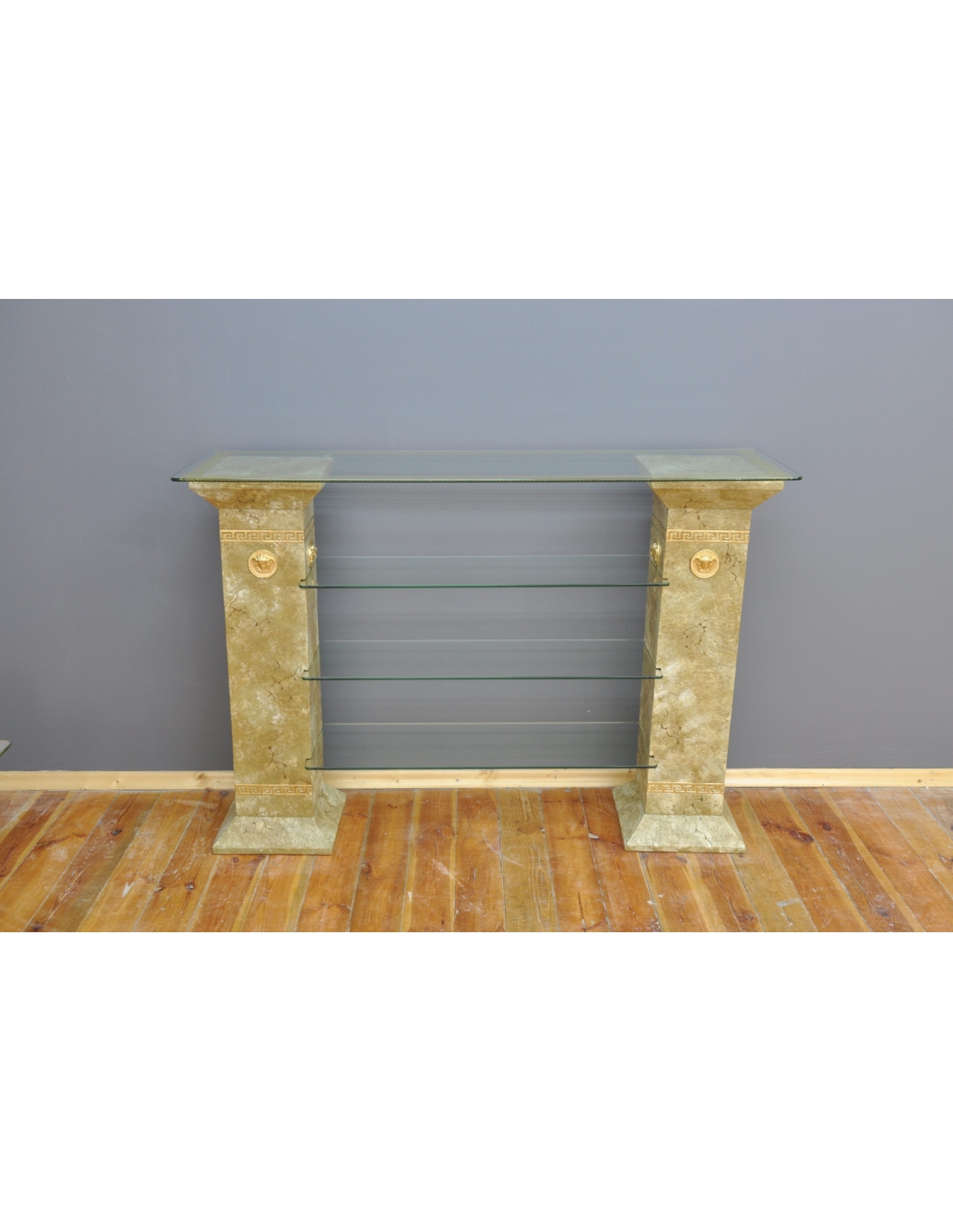 Table console décorative de style grec dorée, étagères en verre, H : 1,01 m