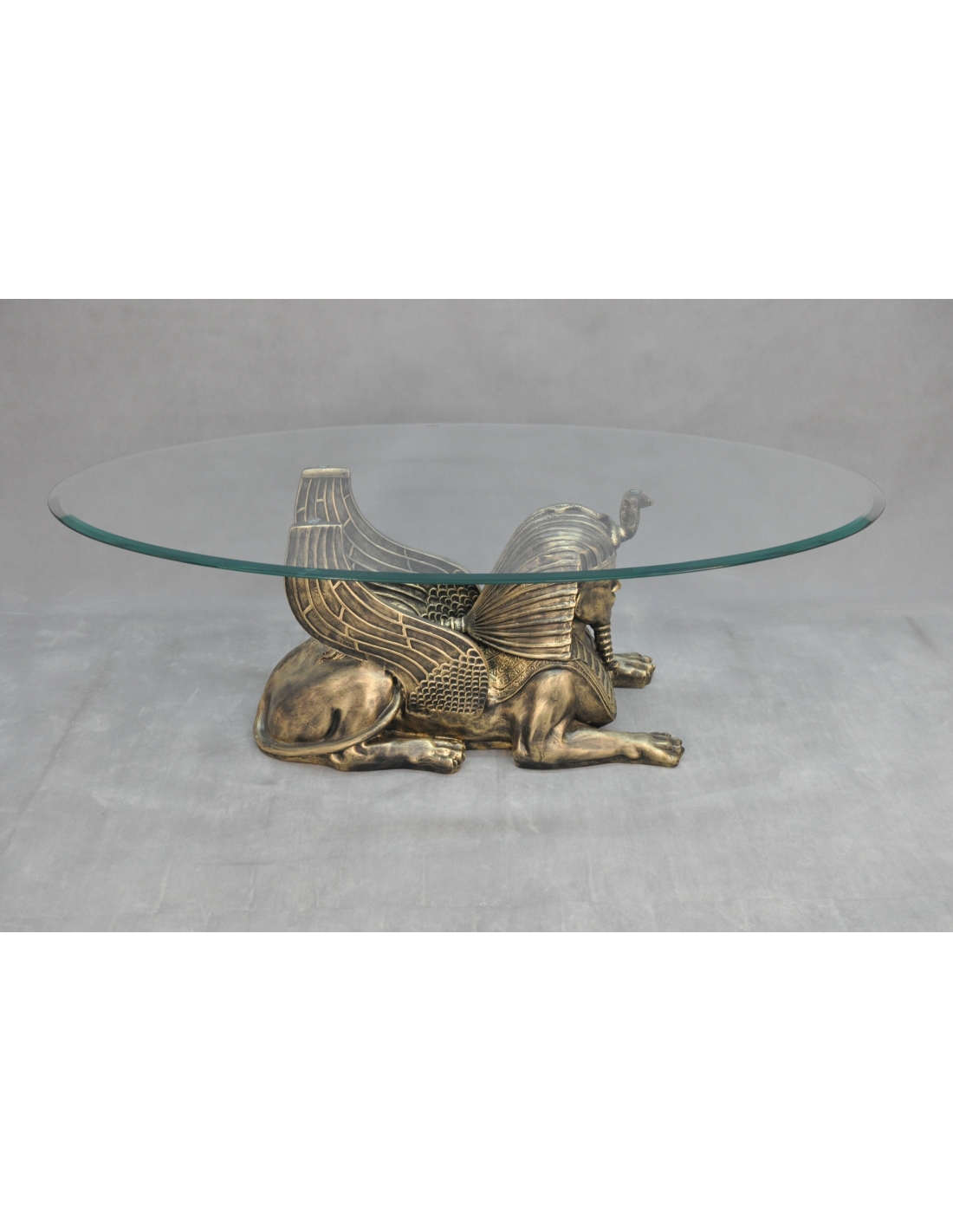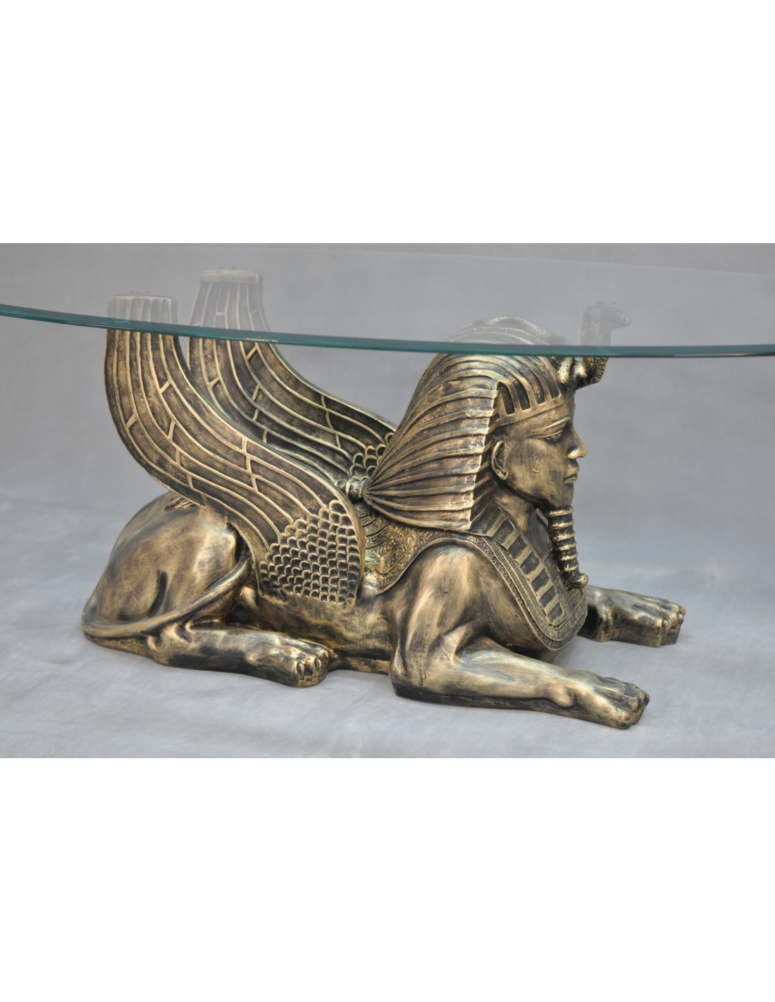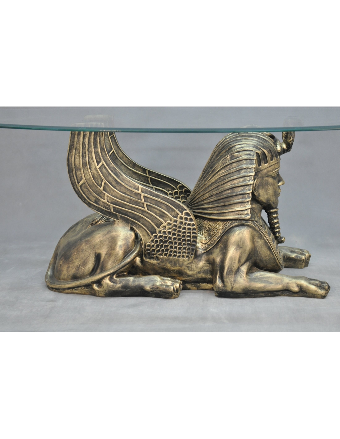 Table en verre avec statue de sphinx, H: 0,5 m