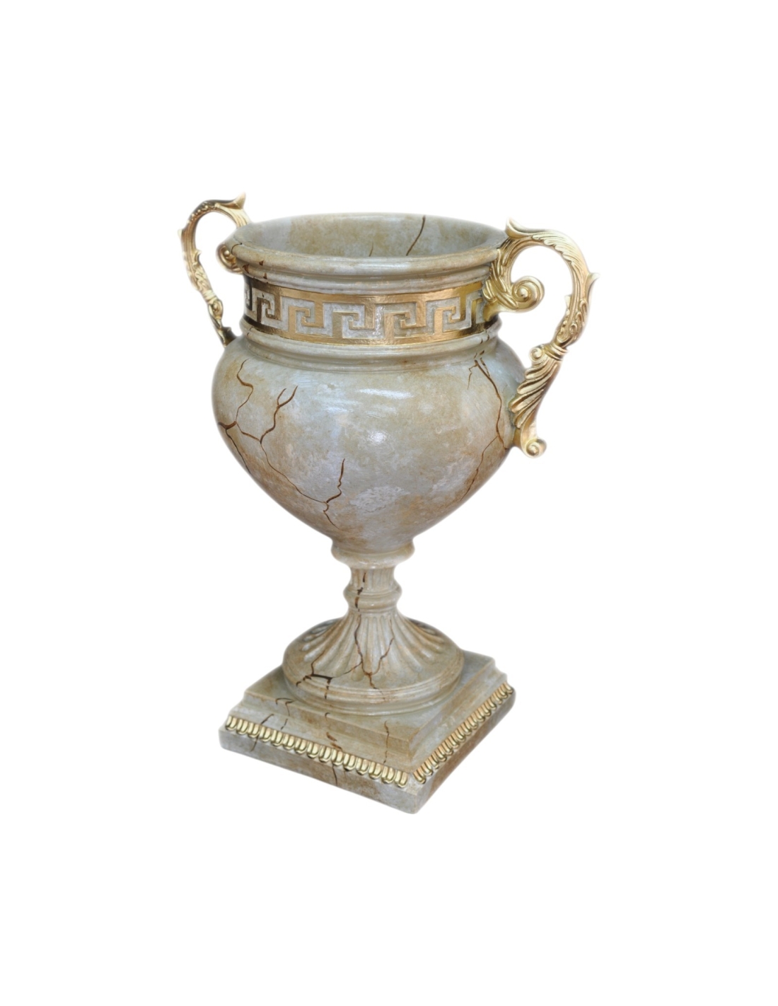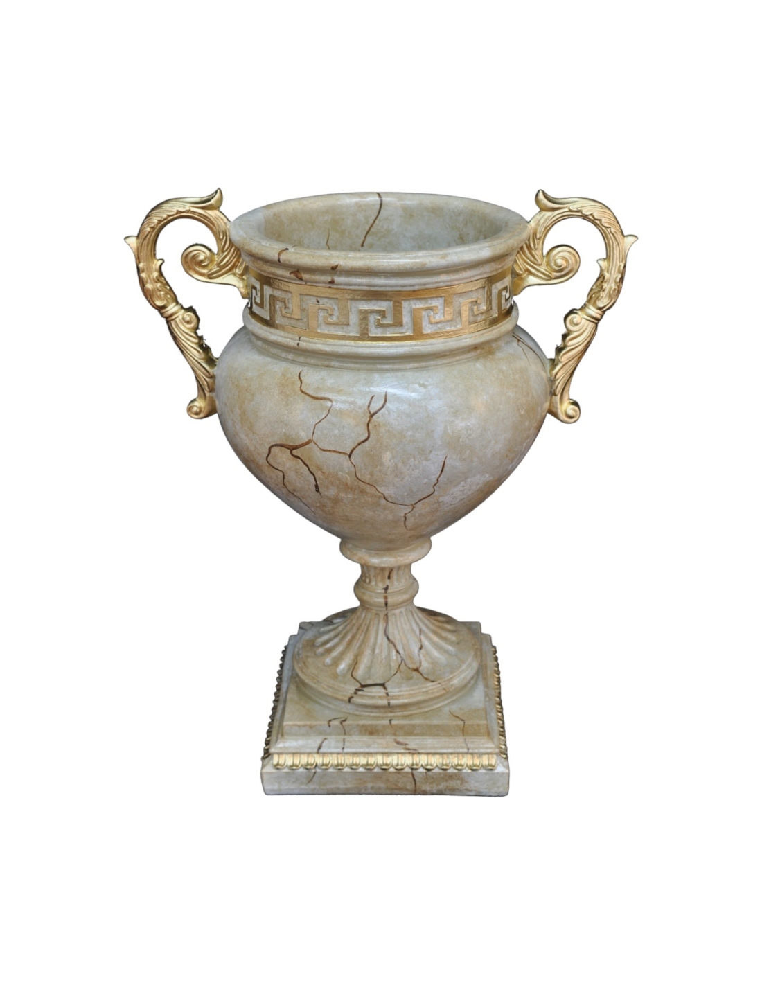 Mariage magistral de design classique et contemporain, ce vase amphore effet marbre est une magnifique pièce décorative. Son corps magnifiquement sculpté, imitant avec brio les veinures subtiles du marbre naturel, est agrémenté de poignées dorées complexes et d'ornements détaillés, créant un effet véritablement opulent. Fabriqué en résine de haute qualité et résistante aux intempéries, cet objet durable et léger est parfait pour une utilisation intérieure comme extérieure. Son design sophistiqué en fait un ajout remarquable et polyvalent à toute maison, bar ou jardin, qu'il soit utilisé comme contenant pour des fleurs ou comme œuvre d'art unique.