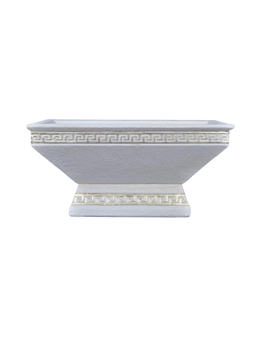 Évoquant la grandeur de l'Antiquité, cette vasque rectangulaire blanche est une pièce remarquable au charme intemporel. Ses lignes épurées et sa forme rectangulaire sont magnifiquement sublimées par des ornements dorés complexes qui ajoutent une touche de luxe et de sophistication. Fabriquée en résine de haute qualité et résistante aux intempéries, cette pièce durable résiste à diverses conditions climatiques. Parfaite pour apporter une touche classique à votre intérieur ou à votre bar, cette vasque polyvalente peut servir de vase décoratif ou d'élément artistique indépendant, mêlant harmonieusement les styles grec et classique.