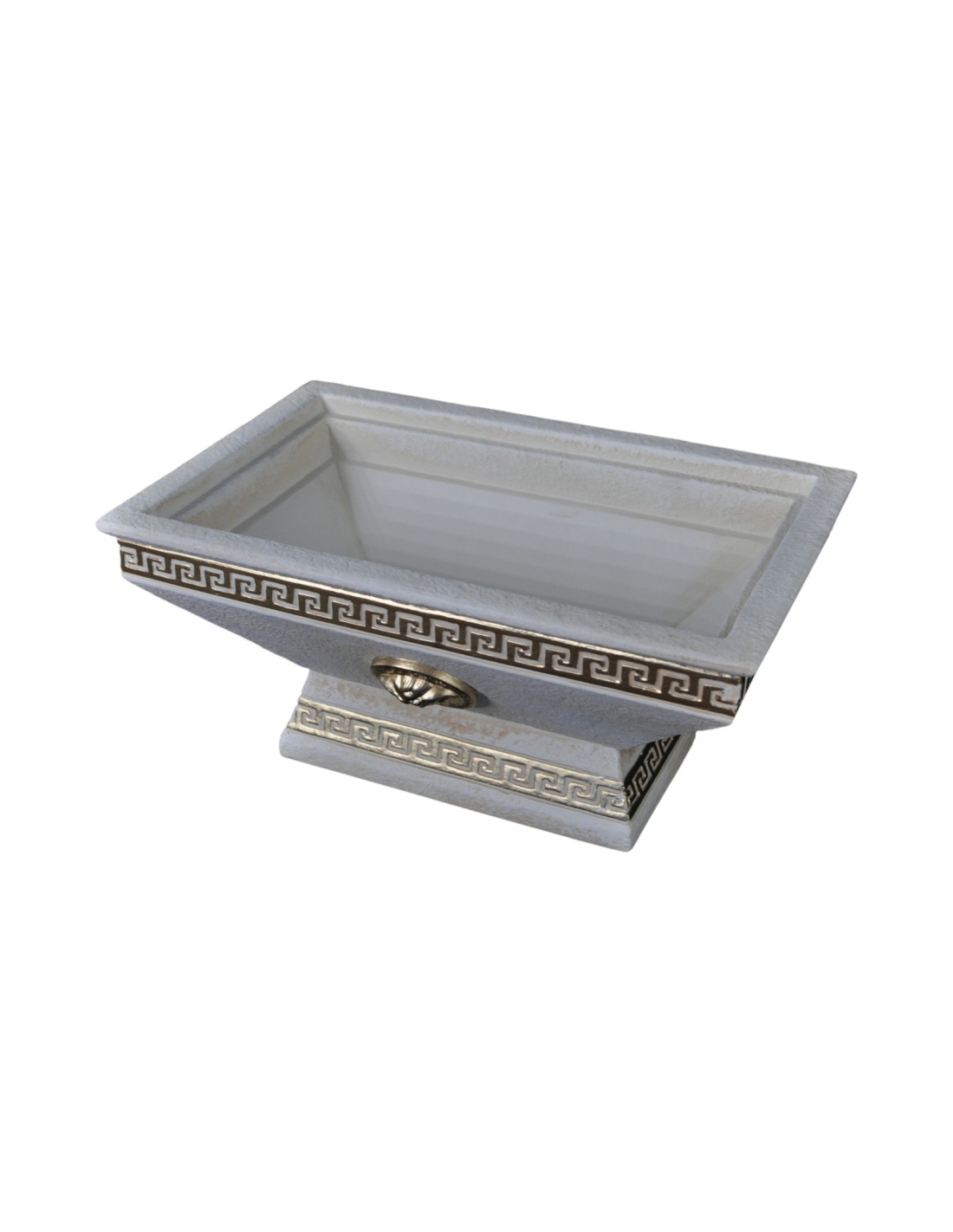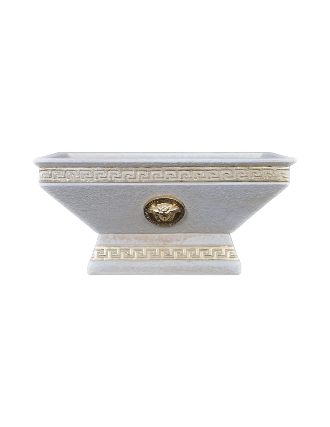 Évoquant l'esprit de la mythologie antique, cette vasque rectangulaire blanche est une pièce décorative captivante au style antique distinctif. Sa forme rectangulaire élégante est ornée d'un relief de Méduse saisissant et d'ornements dorés complexes, illustrant un magnifique mélange d'art et de design classique. Fabriquée en résine de haute qualité, cette pièce durable et légère est parfaite pour ajouter une touche de sophistication intemporelle à votre intérieur ou à votre bar. Utilisée comme vase ou pièce d'art indépendante, elle attirera tous les regards.